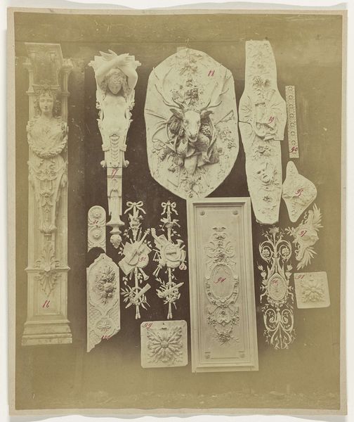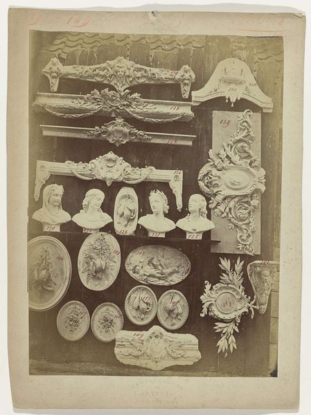 Curator: So, what's catching your eye first here? It's labeled as "Composition of Plaster Ornaments from the Atelier of J. Delbove, Brussels, Belgium," dating roughly from 1860 to 1882. Editor: Hmm, it's strangely compelling, this photographic catalog of plaster bits. It has a ghost-like presence... Makes me think about forgotten grandeur and the ephemeral nature of taste. Do people even *do* this kind of ornamentation anymore? Curator: Well, that’s part of its historical significance. This image acts almost as a sales catalogue. J. Delbove’s workshop would have offered these various plaster components for architectural and interior decoration. They speak to a moment of booming industrialisation when even traditionally hand-crafted elements could be ordered "off-the-rack." Editor: Ah, so it’s all about democratization through production. Still, something about the muted tones—the photo’s aged sepia feel, combined with the blank stares of those tiny cherubs—is giving me a very potent melancholy! They feel ripped from some grand scheme. Curator: And consider how photographs became vital in disseminating and standardizing designs. Architects and builders far and wide could access and replicate these motifs. Think about the role museums play in preserving and displaying plaster casts...It connects directly with how taste is disseminated! Editor: Makes you consider how ornament styles are marketed like seasonal clothing nowadays. Trends and branding—the whole history, really. Even those little cupids… did you see the chubby one holding something? A little banner perhaps? What secrets do those walls hide... Curator: A banner, or maybe an architectural detail of its own. Exactly! These weren't just isolated art pieces; they were cogs in a grand decorative machine. And this photograph helps us unpack the aesthetic ambitions and production realities of a bygone era. Editor: Yeah. This is more than decoration—it’s a reflection of our past obsession with beauty, how we shape and consume spaces. I keep going back to how mournful these bits appear and then there’s you, going "democratization!" Such is art: deeply confusing to one or perhaps it will all coalesce into that something "meaningful," but on *our* time, and not a curator’s clock!