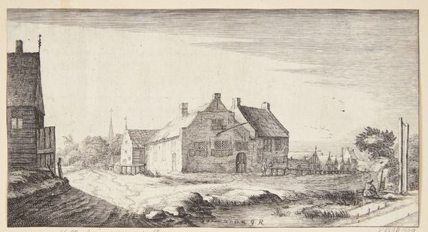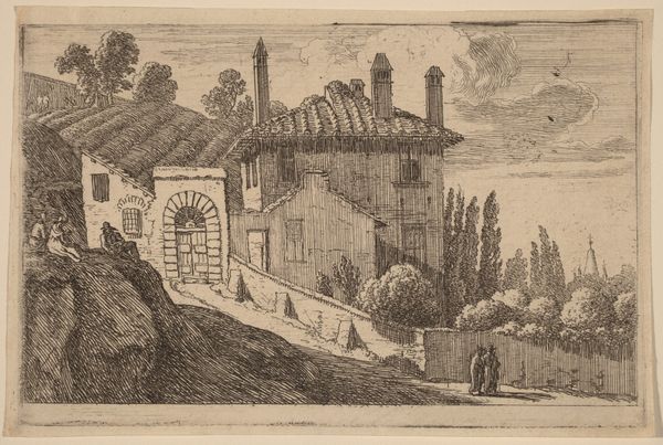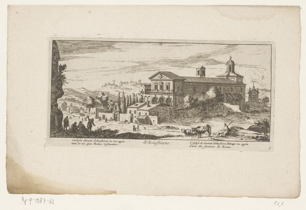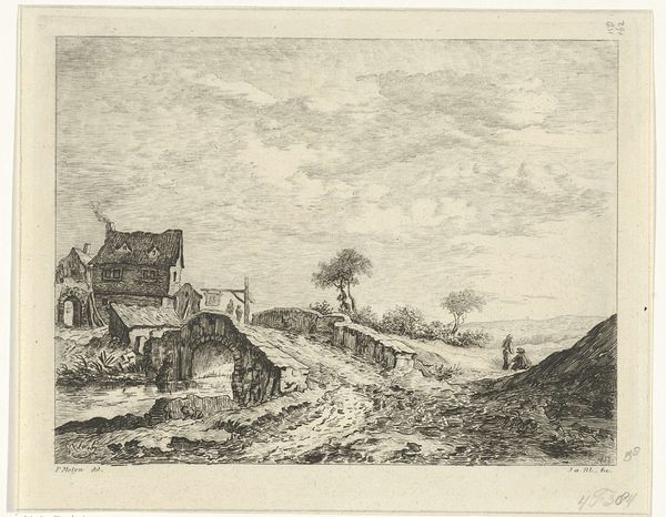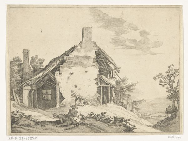 Curator: Herman van Swanevelt's etching, "View of a Ruined Building", presents a contemplative Italianate landscape. What's your first impression? Editor: Somber, definitely somber. There's a melancholic air clinging to those crumbling walls. It speaks of time's relentless passage and the decay of grandeur. Curator: Indeed. Van Swanevelt was part of a group of Dutch and Flemish artists who flocked to Rome, drawn to the light and the ruins. He utilizes etching techniques, probably with multiple bitings to create the atmospheric perspective. Notice the contrast in textures, from the precise lines of the building's remnants to the looser strokes defining the hills and sky. How would you interpret those figures placed throughout? Editor: For me, they are small and insignificant, which emphasizes the monumentality, however dilapidated, of what looms behind them. That central figure riding the donkey becomes an emblem for resilience but also hints at the simple life continuing among this forgotten history. Ruination becomes romanticized as an aspect of time; they suggest cyclical time as a cultural fascination. Curator: Interesting. Consider also how printmaking was expanding in this period. Van Swanevelt's choice of etching made these images relatively inexpensive to reproduce, influencing a whole culture of consuming and representing ruins. What this afforded was, by representing architecture, that architectural techniques were brought more readily into view. One might even suggest that by documenting architecture it provided an important step for thinking about architecture, one akin to the way photography documents and develops new practices of sight, visuality and architecture, albeit a few centuries before! Editor: I can see that. The image as a commodity, making a ruin into something desirable, even fashionable. Etchings like this one also functioned as memento mori, reminders of mortality embedded within a beautiful scene. And the ruins themselves? Their repetitive motifs -- the arch, the window -- invite us to see not just a specific place, but to contemplate on universal themes of decline and the ongoing process of life. Curator: Yes, very well put! Van Swanevelt, through his craftsmanship and the materiality of the etching itself, provides insight into 17th-century aesthetics, revealing the societal value placed on capturing and even possessing these iconic scenes. Editor: And the layers of visual symbolism remind us that even in ruins, the power of images endures. There are many lessons on perspective that viewers, even now, can access because of the circulation and accessibility of the images.