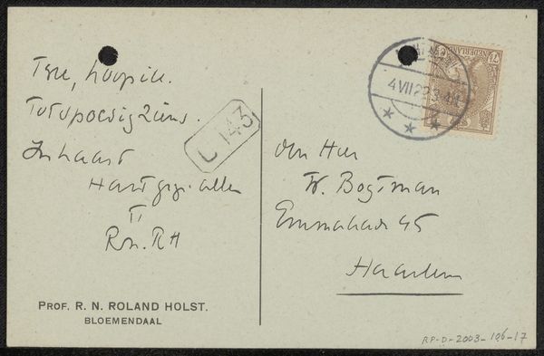 This postcard was written in 1931 by Richard Nicolaüs Roland Holst, and just looking at the handwriting you get a sense of the person behind it. The way the ink bleeds into the paper shows you that, like any artistic process, even sending a simple correspondence is a messy, beautiful thing. I love how the practical and personal collide here: the mundane act of sending a postcard elevated by the artist’s touch. The handwriting, with its quirks and imperfections, becomes a form of expression in itself. Holst isn't trying to hide the process; it's all there on the surface. The stamp placement, the Amsterdam postmark, the smudges – they all tell a story. It reminds me of Cy Twombly’s scribbled paintings, or maybe some early Joseph Beuys postcards. These are artists who understood that art wasn't just about the finished product, but about the traces and the conversations along the way. Art is an ongoing dialogue, a back-and-forth between the artist, the materials, and the world.