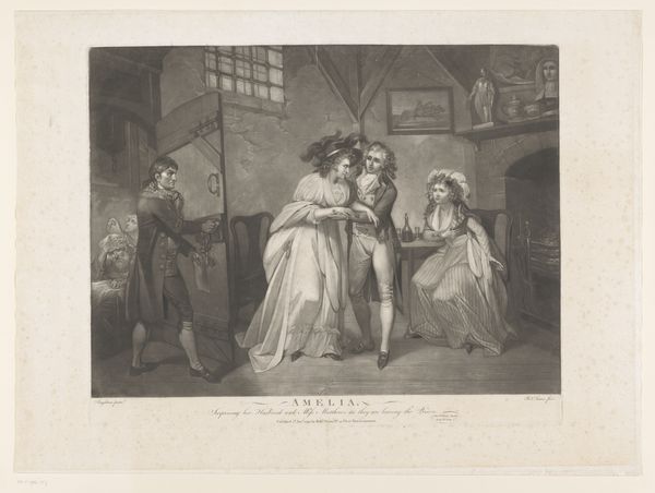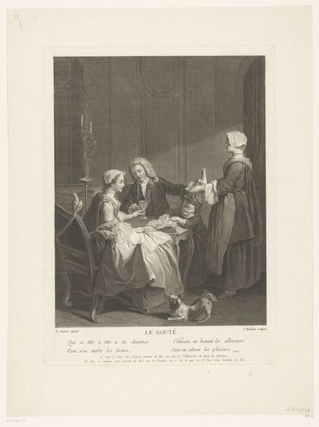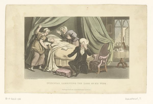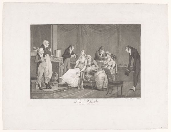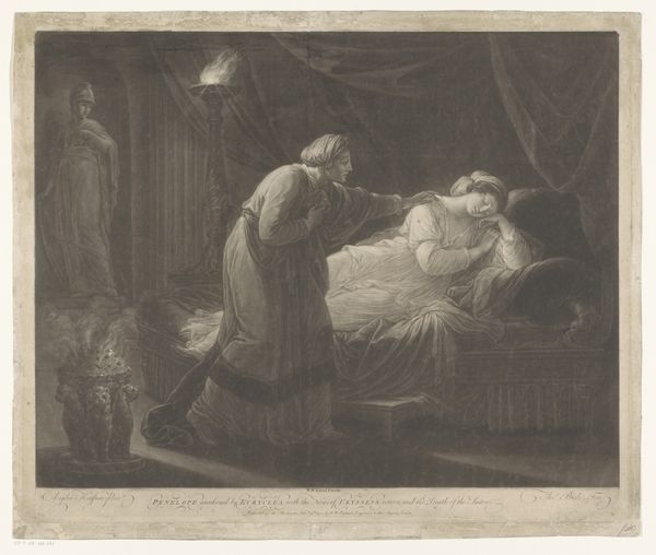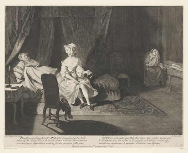 Curator: Look at this engraving, “Slaapkamerinterieur met geschrokken man in een bed” by Nicolas de Larmessin III, created sometime between 1738 and 1755. What leaps out at you? Editor: Chaos! A perfect little tableau of panic and…exposure. A man, jolted awake in bed, a woman clutching her gown, and what appears to be…an intruder with a candle? It feels so melodramatic! Curator: Indeed, it captures a very specific social drama. This type of imagery gained popularity through prints during the baroque period because of their relative affordability and accessibility which encouraged dissemination among bourgeois and aristocratic classes alike. It's really about publicizing or critiquing certain social behaviors and morals. Editor: Critiquing is right! Look at the intruder holding the candle - he looks less alarmed than maliciously amused. It reads as if he enjoys having unveiled something… scandalous. The light flickers across the faces, exposing their hidden secrets. It all looks terribly exciting, not going to lie! Curator: I find myself considering the implied power dynamics. A home, a supposedly private space is exposed as the stage for secrets and potential infidelities. Notice, too, the interior detailing—the ornate chair, the curtained bed – are signs of privilege but don't safeguard those who dwell within. Editor: So, it’s a commentary on vulnerability despite wealth? You make me see the figures differently. The startled man, less a victim and more a perpetrator caught off guard, it also feels relevant to contemporary social debates! Curator: Precisely! Consider how such imagery, multiplied via printmaking, contributed to a discourse around class, gender and the fragility of reputation in the Enlightenment era. It becomes not merely art but a tool in shaping public opinion. Editor: Ah, the ever-watchful eye of society. I'll never look at a frilly baroque chair the same way again. I’m grateful that you highlighted this etching, as a piece about power, gender, and exposure. I now see the hidden layers under all that luxurious linen.