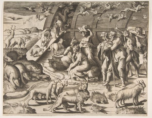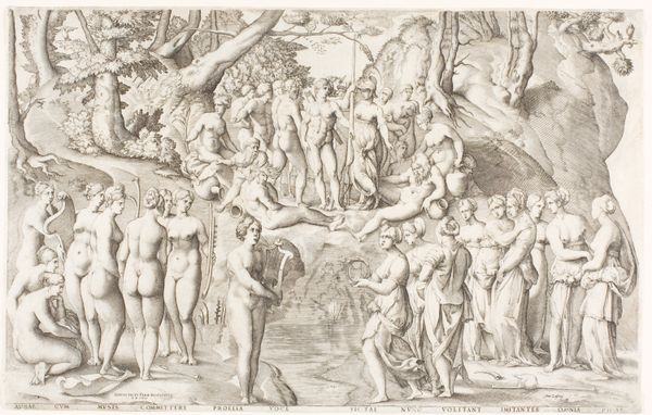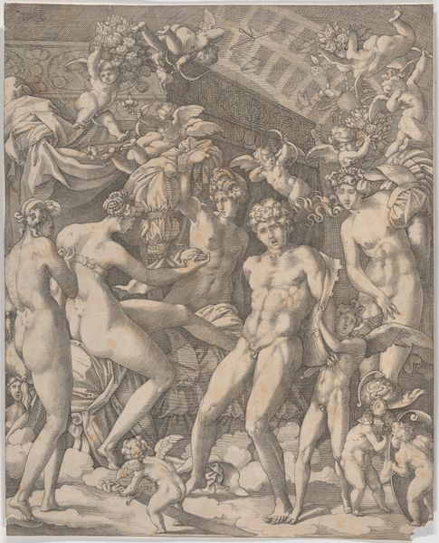 Editor: This is Jan van Haensbergen’s "Paris Giving Venus the Apple," painted between 1657 and 1705, using oil on canvas. The scene is teeming with figures, and the palette is quite vibrant. I'm immediately curious about the process of its creation. What aspects of this piece stand out to you? Curator: Well, immediately I’m drawn to the materiality of it. Consider the canvas itself, how it was prepared, the source of the pigments for the oils, the social context of accessing those materials in the 17th century. It reflects not just artistic skill, but also economic realities and access. How do you think the very process of procuring and combining these materials influenced the final artwork, especially compared to, say, fresco? Editor: That's fascinating. I hadn't considered the canvas preparation and pigment sourcing so directly. Would that potentially restrict artistic expression, based on availability? Curator: Absolutely. Furthermore, baroque art was, in part, about spectacle. Think about the patronage system – who commissioned this, and what message were they trying to convey through the display of such luxurious materials and labor-intensive painting techniques? Was it a comment about power, taste, even access? What might we say of how this access to materials defines art of this period compared to folk art forms which repurposed materials in daily life? Editor: I see what you mean! The contrast between accessible and exclusive creation shines a light on societal structures. Looking closely, I'm struck by the layering of paint. Curator: Indeed. Recognizing and discussing this makes a deep understanding about art practices! Thank you! Editor: Thank you, I see this piece, and artistic creation, in a new light!