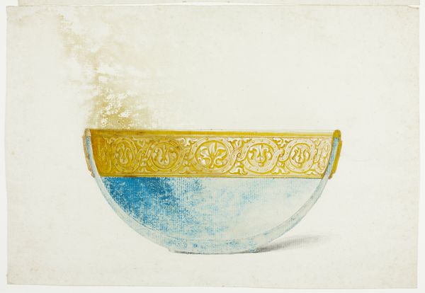 Giuseppe Grisoni created this watercolor called "Jewelled Bowl in the Treasury of San Marco, Venice." The painting invites us to consider the interplay between representation and reality. The jeweled bowl is depicted with careful attention to its ornamentation, and the use of watercolor lends a soft, diffuse quality to the light, which enhances its preciousness. The bowl's structure is defined by a clear division between the jeweled rim and the pale blue body, each rendered with contrasting textures and colors. The upper rim dazzles with gold settings and gemstones, while the bowl features subtle engravings and a cooler palette. Structurally, the bowl is more than a depiction of wealth; it's a study in contrasts—opulence versus restraint, the sharpness of line against the fluidity of color. The painting prompts a dialogue between art and object, representation and essence, inviting us to question how value is both intrinsic and assigned.