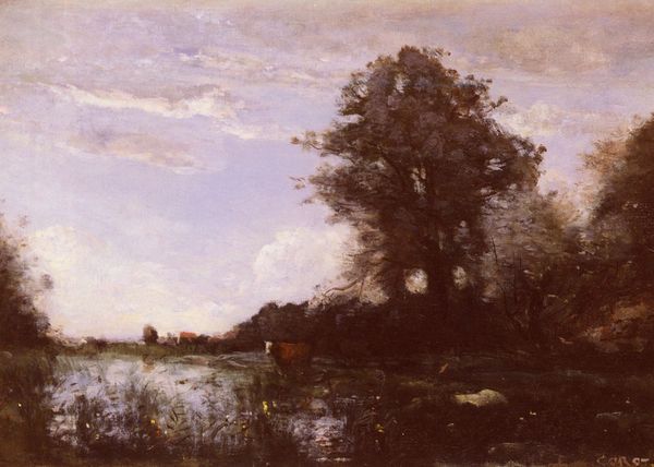 "Pond at Ville-d’Avray" is an oil on canvas painting by Camille Corot. Corot painted during a time of significant social change in France. His artistic roots were in the classical tradition, yet his work paved the way for the Impressionists. "Pond at Ville-d’Avray" reflects his commitment to observe nature closely. The painting depicts a tranquil scene: a figure wading in the pond, cattle drinking, and a group of women by the water's edge. Corot's landscapes often evoke a sense of serenity, but they also reveal the social structures of his time. In rural settings like Ville-d’Avray, daily life was deeply connected to the land and its resources. The women and the wading figure remind us of the labor involved in maintaining this idyllic scene. Corot, though he came from a privileged background, seemed drawn to depicting the lives of those who lived and worked in the countryside. "Pond at Ville-d’Avray" invites us to consider our relationship with nature, and the people who are part of that environment. It prompts us to reflect on the intersection of class, labor, and the landscapes we inhabit.