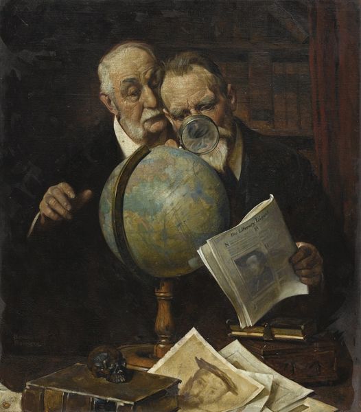 Curator: Noè Bordignon painted this portrait of “Spiritual father Ghevont Alishan in his study” around 1900 using oil paints, employing a meticulous realism that's very striking. Editor: It feels immediately intimate. The sheer amount of paper on his desk gives an impression of tremendous work being done. Look at that watch, it lends to this sensation of a passing of time that is marked by labor and craft. Curator: Yes, Bordignon captures Alishan amidst his scholarly pursuits. Ghevont Alishan was a prominent Armenian Catholic priest, historian, and poet; this image reveals the close connection between religious identity, scholarship and Armenian cultural life at the time. Editor: Absolutely, the layering of these materials creates a rich tapestry. You notice the different shades of cream and white of the paper itself, reflecting a play between artificial and natural that underscores its very construction, all built upon paper and book-binding. We tend to romanticize these figures without recognizing their labor. Curator: A point well taken. Bordignon does not depict him as some distant figure of reverence. Instead, he grounds him in a moment of concentration, surrounded by the tools of his trade: his books, papers, and writing implements. Editor: The oil paint contributes to the weight of the figure in the study and really emphasizes the value of handcrafted works. I wonder how Bordignon sourced his materials and how accessible these high-quality items would have been. These portraits reflect the labor required to craft a shared image, quite like the manuscripts produced at his table. Curator: Considering that Alishan spent much of his life researching and writing about Armenian history and culture, this representation emphasizes the crucial role he played in shaping national identity through literature and historical preservation. It is a fine portrayal of the symbiosis of religious dedication, historical inquiry, and personal industry. Editor: Indeed, it draws me in with its textures, making me reflect on what gets lost and what is made visible through art making.