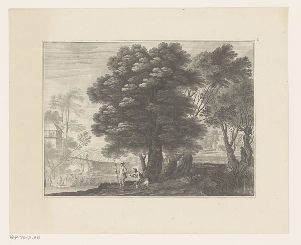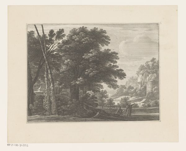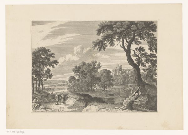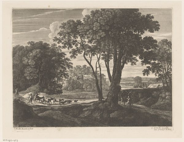 Editor: Here we have "Landschap met wandelaars op een pad," or Landscape with Walkers on a Path, created sometime between 1613 and 1666. It's an engraving on paper attributed to Nicolas Perelle, currently housed at the Rijksmuseum. I find the intricate detail achieved through line work to be really impressive. How do you interpret this work? Curator: The image's strength resides in its manipulation of form and line. Consider the balanced distribution of light and dark. Notice how the artist guides your eye from the foreground figures along the winding path towards the distant horizon. The lines vary in thickness, creating a textural depth that is visually stimulating. Editor: So, it's more about how it looks, how the lines create an experience? I guess I was thinking about who those walkers might be, what their story is. Curator: While narrative interpretations are valid, formal analysis encourages us to first understand the language of the artwork itself. Observe how the strategic placement of trees, acting as visual anchors, punctuates the space, creating a sense of rhythmic progression. What structural elements are you noticing? Editor: I see how the large tree on the right balances the group of trees on the left, almost like they're framing the people. So, it's more about the composition and balance then? Curator: Precisely. The artist employed sophisticated techniques to structure space and light through linear variations and compositional balance. Through these elements, an engagement occurs divorced from external contexts. What has your own observation revealed? Editor: Thinking about it as a set of lines and shapes, rather than just a picture, is a really interesting way to see art. It really does let you see the structure. Curator: Exactly. By focusing on form and composition, a deeper engagement is possible.