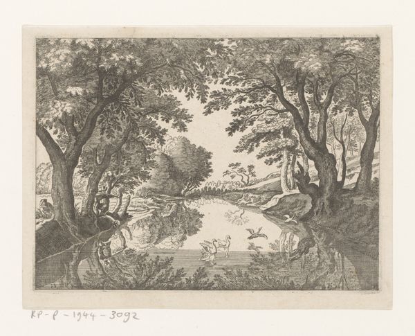Curator: Here we have Franz Kobell’s “Park Landscape” held here at the Städel Museum. It's rendered in ink, pencil, and charcoal— a detailed drawing with elements of Romanticism. What are your initial impressions? Editor: It feels subdued. Brown inks bleeding into each other. I'm drawn to the rough texture of the craggy rock formation on the left juxtaposed against what seems a deliberately serene landscape. Curator: Yes, and considering its probable origins in the late 18th or early 19th century, it certainly reflects a move away from the more manicured gardens of the aristocracy and into a burgeoning appreciation of the ‘picturesque’. What do you think? Editor: Picturesque, definitely. Look at how Kobell layers his strokes! I see a concentration of pencil shading building form around the water's edge and on the face of that striking cliffside. It implies careful, repetitive labor...almost a performative rendering of nature. Curator: Absolutely. It makes me consider the institutional and social changes in art. This wasn’t commissioned by the church, necessarily, but speaks to broader audiences interested in depictions of landscape and nature through the artistic circles and the art market of the time. The artist had to capture that market's attention! Editor: I also notice how he hasn’t depicted human figures within the landscape itself, but look closely...do you see that architectural detail among the distant trees, or am I imagining it? This makes me wonder who this ‘park’ really serves… Who is this idealized view meant for? Curator: That touches on its wider cultural resonance! In showing the ‘natural,’ artists could communicate societal values tied to concepts of nationhood and personal liberty… things developing intensely in Kobell’s era. It’s quite impactful for just charcoal, ink, and pencil on paper! Editor: The impact arises from the hand of the artist; even in capturing the beauty of the scene there are subtle hints about land and property and control! Overall, though, the piece encourages me to think about Romanticism beyond paintings—into drawings, paper, the physical act of observing nature. Curator: Agreed. It opens up layers about Romanticism, societal expectations of nature, and how that period's artists contributed to visualizing these changing values.