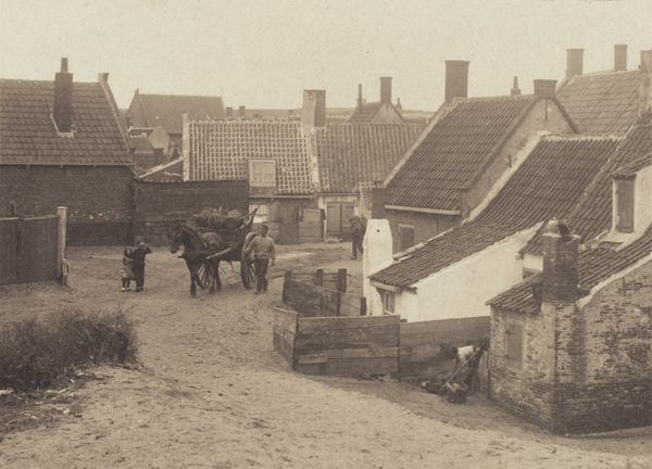 Editor: This gelatin-silver print, "Gezicht op de groenteveiling in Zwijndrecht," was captured by G. Hidderley sometime between 1903 and 1910. The image shows a bustling vegetable auction, I guess! It gives off a strangely peaceful vibe despite the evident activity. The tones are just so gentle. What jumps out at you? Curator: Well, aren't we peeking through time’s veil here! It’s more than just a cityscape; it's a genre scene, capturing the essence of daily life back then. I like that muted palette, too. See how Hidderley uses the light, or lack thereof, to flatten the space? Almost dreamlike. It whispers stories rather than shouting them. It asks a quiet 'remember when?'. It reminds me a bit of Atget. What do you make of the composition? Editor: I notice that my eye is immediately drawn to the woman in the center, with the apron; it gives the photograph a focal point and grounds the scene, but at the same time, she seems… still amidst all the presumed hustle. Is she symbolic of something, perhaps? Curator: Ah, an excellent observation! Absolutely, it’s not merely documentary. It’s tempting to project onto her, isn’t it? Consider how her stillness creates a tension. Maybe she represents the enduring spirit of the working class, the quiet dignity within the clamor. Or maybe I’m just making stuff up as I go along – but isn't that the joy of it all? The beauty of uncertainty? It reminds me of a haiku, capturing a moment but inviting endless reflection. What will *you* carry away from this piece? Editor: You’re right, there's so much room for interpretation! I guess for me it's this snapshot of a moment, capturing everyday life but also hinting at broader social and historical contexts. Curator: Precisely! It’s not just looking; it’s seeing…feeling…becoming, momentarily, a part of that time. Beautiful, right?