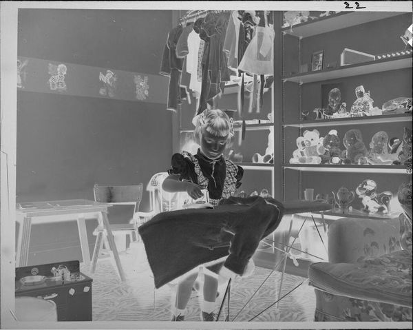 Curator: This photograph, simply titled "Untitled (child on floor looking out of doorway)," is credited to Lucian and Mary Brown, though its precise date remains unknown. The gelatin silver print measures roughly 4x5 inches. Editor: Immediately, I’m struck by the stark contrast and the somewhat unsettling gaze of the child. The wallpaper is also quite present in the composition. Curator: The image offers a glimpse into domesticity. Consider the labor involved in maintaining such a space – the wallpapering, the cleaning, the care of the child. These are often invisible forms of work. Editor: And how that domestic space becomes a stage. The child's gaze confronts us, pushing us to question the roles and expectations imposed upon them within that environment, framed by race and class. Curator: True. It's a fascinating exploration through material culture and the construction of identity within a specific social framework. Editor: Indeed. It leaves me pondering the power dynamics inherent in the act of photographing a child in such a staged, yet intimate, setting.