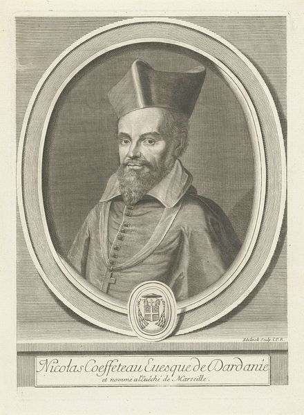 Jan Baptist Jongelinx created this print, "Portret van Joseph de Bergaigne," using engraving techniques. This portrait invites us to consider the intertwined relationship between religious identity and aristocratic power in the 18th century. Joseph de Bergaigne, depicted here, was not only a bishop but also a member of the nobility, as suggested by the coat of arms. The visual language of this portrait—from his clothing to the architecture surrounding the inscription—speaks to his high social standing and spiritual authority. Consider how the details of his garments communicate a sense of power, while the somewhat softened lines around his face convey something of his humanity. This work offers a window into a world where religious and secular power were deeply entwined.