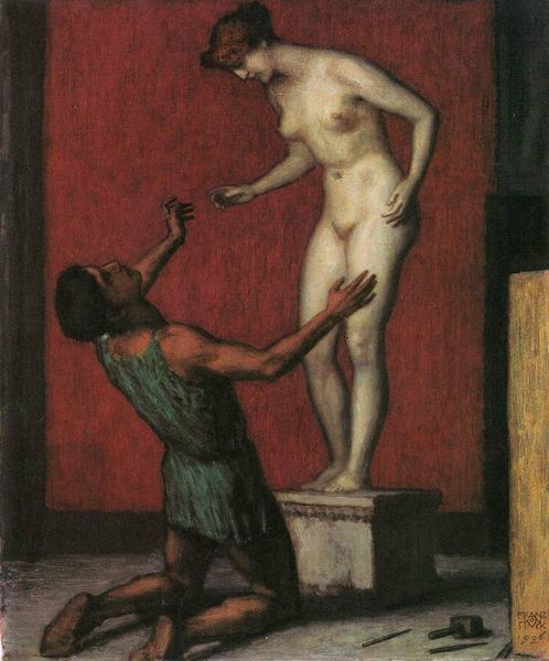 Curator: This is "Toilette," a compelling 1906 oil on canvas by Pablo Picasso. Editor: It feels...incomplete. The starkness and somewhat raw presentation certainly convey an intense moment. There's vulnerability but also an air of detachment. Curator: The figures here are not individual portraits so much as studies in form. Consider the angularity, the geometric simplification of the bodies. This pushes toward abstraction. The color palette contributes as well; it’s constrained but deliberate. Editor: Absolutely. Looking at the painting through the lens of its historical context, the image aligns with a broader fascination with female subjectivity during the period. The “Toilette” theme, the intimate moment of self-care, becomes a culturally loaded scene within the bourgeois lifestyle. One wonders about the viewers imagined here? Curator: Indeed, and the figures' relationship adds intrigue. We have one caught mid-action with her arms overhead arranging her hair. But who is the other figure observing? Their purpose and expression are so wonderfully vague. Their gaze feels neither entirely voyeuristic nor particularly involved. The effect of having two figures instead of one multiplies the number of angles we can analyze and discuss about this painting. Editor: I wonder how it spoke to prevailing debates about female beauty and societal roles in early 20th-century art? Was Picasso attempting to subvert or reinforce them through this study of the female form? Curator: We can also examine its impact on modern art's evolution. Picasso began reducing human forms into simpler geometries, and this tendency eventually led him into Cubism a few years later. That exploration of shape and reduction is quite compelling and something we may want to observe closer in this space and beyond. Editor: Agreed, there are lots of interpretations! I find the interplay of psychological intimacy and artistic detachment fascinating. Curator: Indeed! "Toilette" gives us much to ponder in its use of line, form and historical setting.