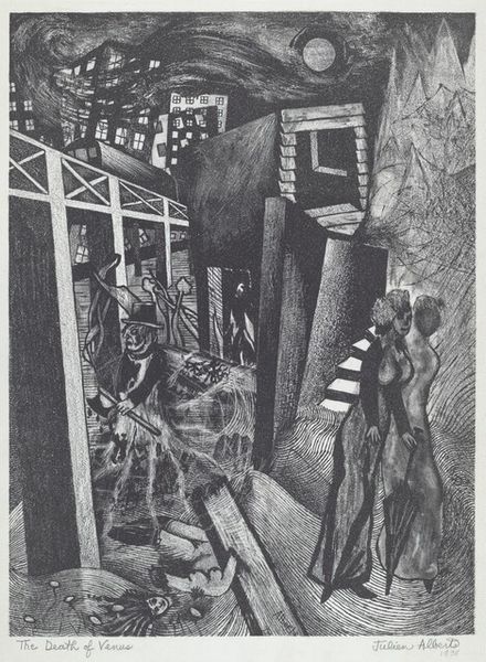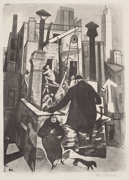 Lillian Adelman created this untitled lithograph on stone in the mid-20th century, a work dominated by geometric forms and stark contrasts. The composition features a series of interconnected architectural shapes, rendered in shades of grey, creating a dense urban landscape. The texture is achieved through the lithographic process, giving a gritty feel to the surfaces. Adelman plays with perspective, distorting traditional spatial relationships to suggest a city in flux. The high contrast accentuates the underlying structural elements, destabilizing any fixed interpretation and challenging our perception of urban space. This recalls the fragmentation of Cubism, where objects are broken down and reassembled to reveal their underlying structure. Notice how the artist invites us to consider the city not just as a physical space but as a construction of abstract forms, reflecting a modernist concern with the essence of structure. The lack of color and the emphasis on line and shape underscore the formal qualities, making the artwork an exploration of the architectural and the abstract.
