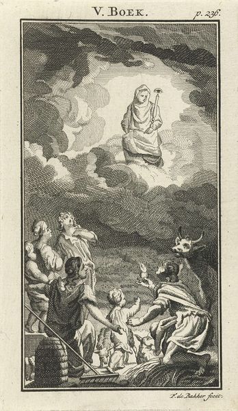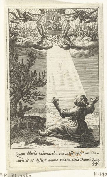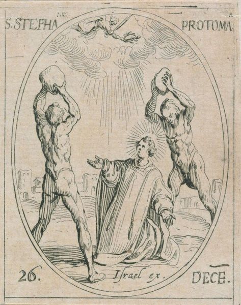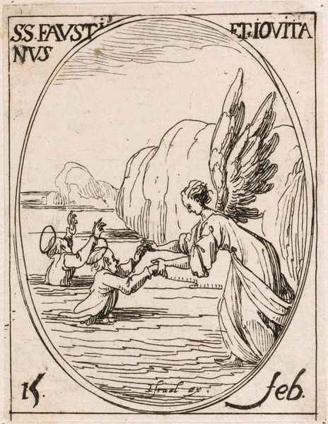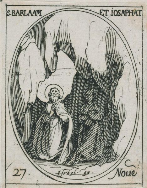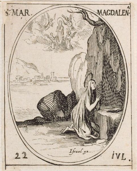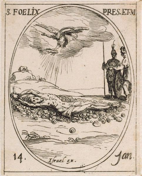 Curator: Jacques Callot, born in Nancy, France, around 1592, created this small etching titled "Saint John the Evangelist." Editor: It's surprisingly serene given how much detail Callot crams into such a tiny space. The hatching creates so much texture. Curator: Notice how John looks upward, bathed in divine light? The eagle beside him, a symbol of inspiration, emphasizes his role as a visionary. Editor: The technique, the cross-hatching, it's all about creating gradients of light. And the plate itself, think of the labor involved in etching those fine lines! Curator: These symbols aren't accidental. They create a narrative, one that reinforces John's spiritual authority and connection to the divine. Editor: The sheer volume of marks impressed onto the paper becomes meaningful. It's a testament to Callot's skill and the printing process itself. Curator: Seeing these layers, knowing how the symbols resonate through time, is what makes this piece so powerful. Editor: I agree, it's interesting to think about the labor, the meaning, and the mark it all leaves behind.
