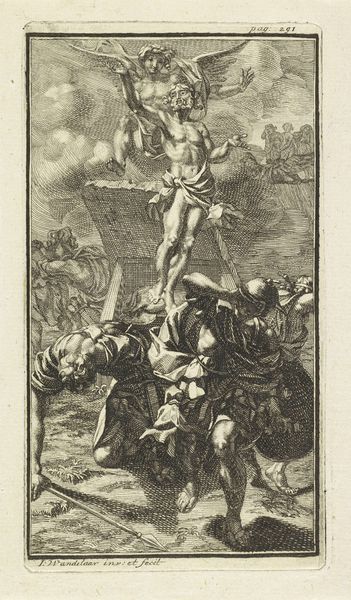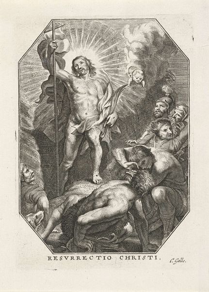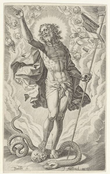 Curator: This is Johann Sadeler I's "Resurrection," held at the Harvard Art Museums. I'm immediately struck by the almost brutal physicality rendered with such fine lines. Editor: All that divine light, yet the cherubic faces seem almost incidental, like a decorative afterthought to this triumphant return. It feels more about human aspiration than heavenly presence. Curator: It's fascinating to consider how the engraving process itself—the labor of creating those fine lines—contributes to the sense of embodied power. The musculature isn't just drawn, it's built, etched into the material. Editor: The soldiers at the left recoil in terror, underscoring the cultural weight of the resurrection image. And I note the haloed angels flanking Christ, guiding the eye upward from turmoil towards divinity. Curator: And don't forget the cultural exchanges in play here: Sadeler, a Flemish artist, interpreting an Italianate style. It reveals how artistic labor circulated within a specific economic and social context. Editor: True, but it also speaks to the enduring need across cultures to visually represent this potent symbol of hope, of overcoming mortality. Curator: Absolutely, and the act of repeatedly printing and distributing such images only further solidified their cultural and religious significance. Editor: Considering Sadeler's technical skill and the symbolic weight, it makes one contemplate the power images hold in shaping belief.