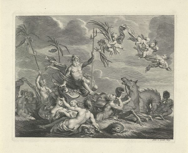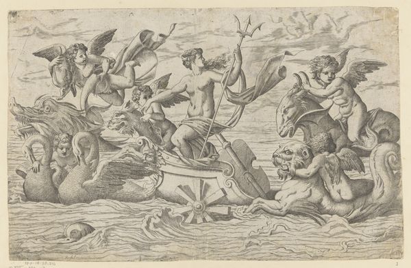 Curator: This is a captivating engraving entitled "Neptunus op zijn triomfwagen," created circa 1621-1622, and we hold it here at the Rijksmuseum. Editor: It strikes me as rather bleak, though technically impressive. The composition is intricate, almost overcrowded, with the rough sea and sky pressing down on Neptune's procession. Curator: Baroque art often used such theatrical displays. We can analyze this engraving in relation to its historical moment, focusing on how imagery was used to convey power and idealize leadership. This piece places Neptunus as a leader, commanding the sea and mythic creatures. The symbolic usage in depicting ideal governance can be seen as quite powerful in its social context. Editor: Precisely. Engravings like these also circulated widely. How do you see the material process of producing this artwork as potentially impacting or changing its cultural impact and the role of imagery? Curator: The engraving medium democratized the image somewhat. While paintings remained largely within elite circles, engravings like this allowed wider distribution of mythological and allegorical themes. Look closely; it invites engagement and propagates political ideals further than paintings could. It turns viewership into social engagement, far beyond appreciation, really. Editor: Absolutely, these images weren't passive objects. We can imagine people discussing these figures of power and how they impacted life under various political structures. To create works with such complex narrative implied an ambition far beyond the aesthetic. Curator: The skill in rendering depth and detail in an engraving also shouldn't be ignored; its level of intricacy elevates its status above simple political advertisement into an artistic pursuit and display of mastery. Editor: Ultimately, by seeing this work through the lens of the politics of imagery, we begin to reveal that this engraving does more than capture our eye. It speaks volumes on Baroque values regarding the control of imagery, the communication of social standards and political might, and also the means through which such displays gained momentum. Curator: Right, so while it initially seemed “bleak” to you, considering how this engraving participated in a dialogue on ideal rulership gives "Neptunus op zijn triomfwagen" a whole other depth.