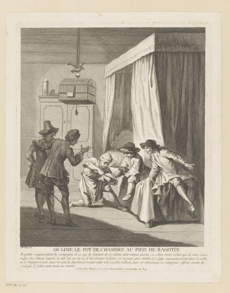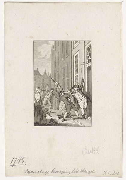 Editor: This print, “Groep schooljongens op straat, twee jongens doen een dansspel”, or translated roughly "Group of schoolboys in the street, two boys doing a dancing game," created in 1770 by Augustin de Saint-Aubin and currently housed at the Rijksmuseum, feels incredibly energetic, almost chaotic. What do you see when you look at this piece? Curator: Ah, yes! What a joyous release captured in ink. Imagine, these boys, penned up all day, suddenly spilling out, unbound! Look closely. Notice how Saint-Aubin doesn’t just depict them running; there's a theatricality, wouldn't you agree? They’re almost dancing—perhaps celebrating freedom, mocking their schoolmasters, or simply reveling in the exuberance of youth. It whispers of the Rococo spirit—frivolity and charm. Editor: I do notice it now that you mention it. The clothing almost feels performative as they are escaping the doors. Was this commentary typical? Curator: I think so, in a way. Don’t forget, prints like this were often intended for a relatively wealthy audience, an educated audience familiar with classical ideals and social satire. It reflects the prevailing societal views on education, childhood, and leisure. There’s also a clever use of the printed word to suggest these deeper themes. Almost ironic! Editor: So it's more than just boys having fun. Curator: Exactly! It's a carefully constructed scene reflecting deeper currents. Art isn't merely a depiction of reality, it’s an exploration of it. That is its great beauty, if you ask me. Editor: It gives me much to think about when looking at other art forms from this period as well. Thanks! Curator: My pleasure!
