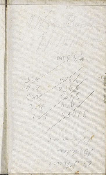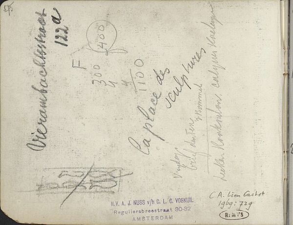 Editor: This is "Notities," a drawing in ink on paper, made around 1905-1906 by Carel Adolph Lion Cachet. It seems to be a page from a sketchbook, filled with handwritten notes and numbers. The layout feels almost like a deliberate composition. What do you see in this piece, from a formal perspective? Curator: The initial aspect that strikes me is the interplay between order and disorder. Note how the script, while appearing casual, adheres to a vertical axis, suggesting a structured framework. Observe also the tonal variation achieved solely through line weight and density of the ink; these features manipulate the visual hierarchy. Do you see how this seemingly arbitrary arrangement achieves a balanced asymmetry? Editor: I do, especially in how the heavier script on the left is counterbalanced by the simpler, sparser marks to the right, but I’m curious – is the specific content important, or just the form? Curator: While we cannot disregard the semantic content, which presumably holds personal meaning for the artist, our focus resides in the tangible elements. The contrast in calligraphic styles—the hurried jottings against the more deliberate lettering—serves an aesthetic purpose. The page itself becomes a field of textual and numerical abstraction. Consider the relationship between the marks and the blank spaces; how the white of the page actively participates in the composition. Editor: So the value is not in *what* the writing says, but in how it contributes to the overall design and visual rhythm? Curator: Precisely. Lion Cachet manipulates writing itself as a visual element, transforming a commonplace notebook page into an object worthy of aesthetic contemplation, a proto-conceptual piece, if you will. Editor: I hadn’t considered it that way. Now, I can definitely see the design elements standing out more clearly! Curator: Indeed, and now hopefully a different perspective through which we may come to look at sketchbook art!