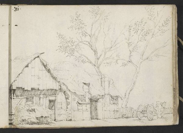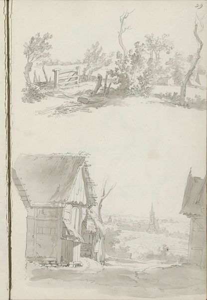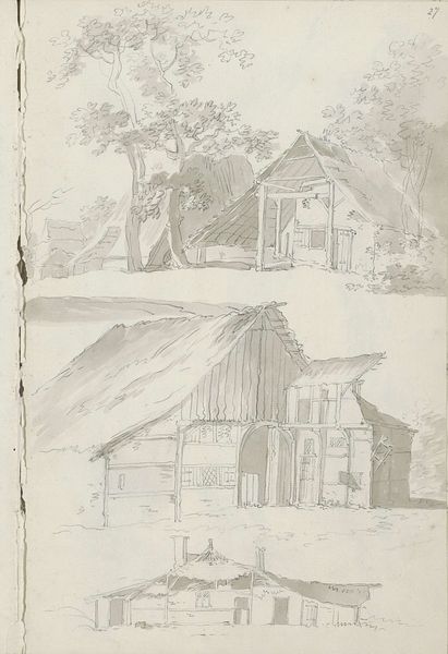 Barend Hendrik Thier made this drawing of farmhouses using graphite and grey wash. The drawing depicts two rural dwellings in what was then the Batavian Republic, present-day Netherlands, during a time of political upheaval. The late 18th century saw the rise of Patriot movement, seeking democratic reforms and challenging the old order. Visual codes of rural life and local identity became important. The drawing’s seemingly straightforward depiction of farmhouses could be viewed as a comment on the virtues of the common people in contrast to the ruling elite. Institutional histories also influence how we see this artwork. The Patriot movement was eventually suppressed, and the Batavian Republic fell under French control. Thier's drawing serves as a historical document, reflecting a society in flux. To understand this drawing more fully, we might consult archives, political pamphlets, and local histories. The meaning of art is always contingent on its social and institutional context.