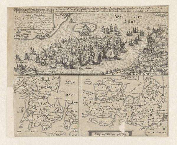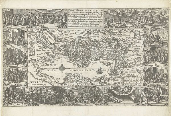 Curator: Stepping into the cartographic world, we encounter "Kaart van Israel en Egypte," a map of Israel and Egypt from around 1604, created by Pieter Bast. The medium here is engraving, a graphic print showcasing a fascinating landscape and historical perspective. What are your initial thoughts as you gaze upon this piece? Editor: Woah, it’s a whole little world encapsulated! Kinda feels like peeking into a time machine, right? I'm immediately drawn to how detailed everything is; I could just get lost wandering through all those tiny cities. Plus, there's this sense of old-world adventure seeping out of it, does that make sense? Curator: It makes perfect sense. Considering the historical context, these maps were not only geographical tools, but also reflections of power and knowledge. They functioned to portray the world as it was understood through a European lens at that time, reflecting colonial ambitions. Think of this representation of the ‘holy land’ as it impacted European perspectives. Editor: That definitely puts a new spin on things. The religious implications were clear in how precise this rendering is! Like they wanted to 'capture' a sense of sacred places. Curator: Indeed. Look closely at the borders surrounding the central map. Notice how they depict biblical scenes? It merges geographic depiction with biblical narrative. This combination solidified the link between the territory, faith, and European cultural identity. This reflects an early modern desire to both understand and control space. Editor: Ah, now I get it! It is both claiming ownership and trying to decipher what the land might represent or even hold for them as a collective. Almost like a visual manifesto, binding geography with destiny and their beliefs. Amazing how something that looks like a simple map can be so layered. Curator: Precisely. Maps are not neutral objects. "Kaart van Israel en Egypte" reveals much about the ambitions, beliefs, and socio-political power dynamics of its time. Understanding these intersectional narratives enhances our experience of the piece. Editor: I’ll say. It went from interesting image to a multi-layered symbol pretty quickly. I’ll definitely carry that sense of context with me now when looking at historical maps; thanks!
