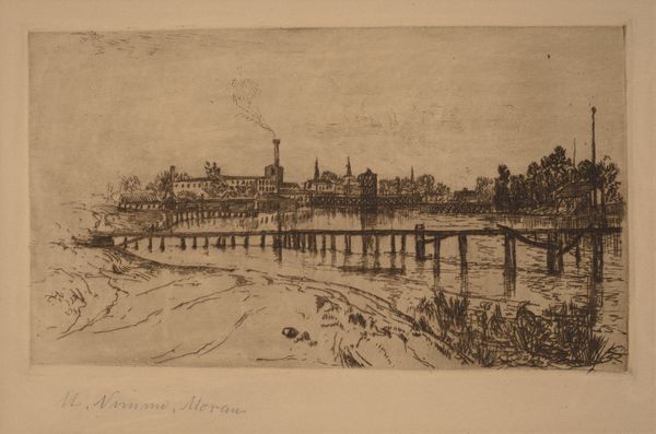 Curator: What a beautifully somber scene. D.Y. Cameron created this intaglio print, etching "Albert, Railway, and Victoria Bridges, plate six from the Clyde Set," around 1889. Look at the industrial atmosphere evoked. Editor: There’s something hauntingly still about it, even with the steam billowing in the background. The reflections on the water create this lovely mirroring effect, almost doubling the city’s weight. It's heavy but beautiful. Curator: Indeed. Cameron masterfully uses line and texture to construct spatial depth. Note the contrast between the solidity of the bridges and the vaporous quality of the smoke. It emphasizes a semiotic tension between industry and nature. Editor: Right! And the composition, anchored by those strong horizontals of the bridges and their reflections, leads your eye straight to the distant skyline. Is it me, or is there something almost dreamlike about the architectural details barely visible there? Curator: Precisely! The blurred background does introduce an element of ethereal, atmospheric perspective. That focus is intentional; the structure itself takes a symbolic place as a signifier. Notice too, the restrained palette and delicate gradations. It invites slow, contemplative viewing, emphasizing that period's embrace of industrial progress and its impact. Editor: But don’t you think that the limited colour palette evokes the city in winter? Those little boats below barely move against a very grey light. Curator: Undoubtedly. The somber tonality establishes an emotional resonance, a melancholy that I think we can see is reinforced by its formal, almost architectural organization. Editor: Well, Cameron certainly made this cityscape memorable and beautiful despite all the grit. The industrial period doesn't come across often as serene, but the print offers quiet reflection and admiration. Curator: It's a superb illustration of how form, materiality, and historical context unite to produce meaningful expression. A remarkable piece.