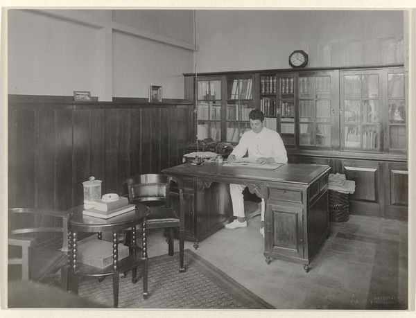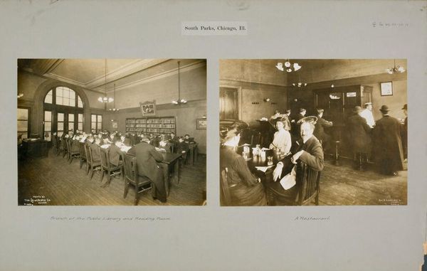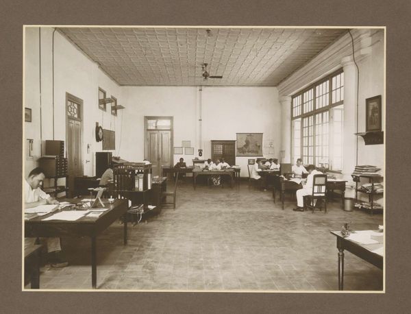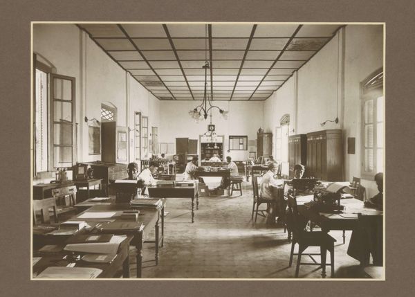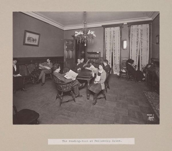 Editor: This photograph by Apeda Studio depicts a general reception room at the Hebrew Sheltering Guardian Society Orphan Asylum. The composition feels very formal and staged. What structural elements stand out to you? Curator: The photograph's orthogonal lines create a rigid structure, drawing the eye to the center. Note the light, how it's distributed. The variations in tone and texture across the room add depth, but the figures are deliberately arranged. What does their arrangement suggest to you? Editor: Perhaps a sense of order and control within this space? I find that interesting. Curator: Indeed. The photograph's strength lies in its formal construction and meticulous arrangement of elements. Together, they create a narrative about the space. Editor: I see now how the visual elements contribute to a deeper understanding.