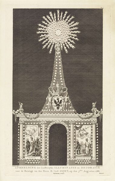 Curator: This is a print from 1695 titled "Mausoleum erected in Westminster Abbey for the deceased Queen Mary Stuart." It’s by an anonymous artist, held at the Rijksmuseum. It looks incredibly ornate, almost like a stage set. What grabs your attention first? Editor: The overwhelming amount of detail, I suppose. All the crowns and sculpted figures feel deliberately excessive, but how does that connect to Mary Stuart? What’s the message behind all of this ornamentation? Curator: Well, consider the medium: an engraving, a relatively reproducible and therefore accessible format. Think about who would have commissioned this. Was it a private expression of grief or something intended for wider consumption? This mausoleum, whether real or imagined, is being presented as a symbol of power, and more importantly, legitimate succession. Notice how the materials depicted—stone, precious metals—are rendered meticulously. Is it to remind us of actual riches or the *idea* of richness and status? Editor: So it's less about mourning a person and more about constructing a narrative around power? The emphasis is on displaying authority, perhaps solidifying the Stuart legacy after her death, instead of focusing on, say, the personal qualities of the deceased. Curator: Exactly. The visual language itself—the repetition of symbols, the architectural scale—suggests a machine for producing meaning. Do you think there's an inherent tension between the purported spirituality of a mausoleum and the blatant display of wealth? Does the print flatten or elevate it? Editor: It does feel contradictory now that you mention it. The engraving’s almost clinical depiction of luxury feels almost critical, even though that may not have been the intention. I never considered how the very act of reproduction in print could itself be a commentary. Curator: Considering art from a materialist angle gives you tools to start questioning seemingly obvious symbolism and thinking about the process and context of its making. Editor: I will definitely consider how social status may dictate art and ways of consuming it.