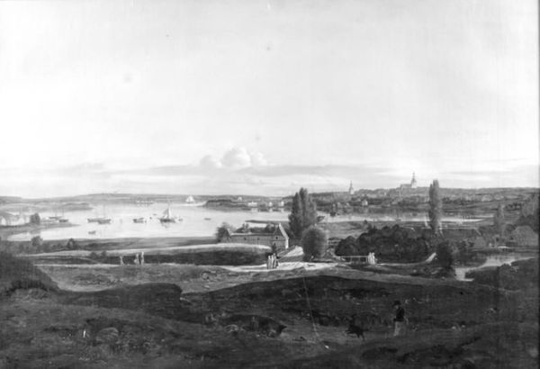 Curator: Let’s discuss J.P. Møller's 1825 oil on canvas, “View of Kronborg, Helsingør and the Sound.” A Danish landscape painting. Editor: The first thing that strikes me is its monochrome palette. There's a certain stillness and quiet melancholy about it. Despite depicting quite a busy port city. Curator: It's a masterful use of atmospheric perspective to evoke a sense of distance. Consider, however, how artists depicted landscape in 1825, shortly after the Napoleonic wars and during the Danish Golden Age. How do depictions of ‘nature’ reflect ideas of national identity? Editor: I’m curious about Møller's choice to present this vista in what appears to be almost solely grayscale. Does the exclusion of vibrant colours subtly suggest themes of loss, perhaps linked to Denmark's changing geopolitical status at that moment? Curator: Certainly, one could interpret it that way. It might also just reflect artistic trends of the time, playing with light and shadow to achieve a particular aesthetic effect. There was a huge rise in popularity of graphic works using similar colours. Editor: I would ask though; can that artistic decision be separate from broader anxieties felt about identity? How do these decisions shape national consciousness through their very forms? And considering Kronborg castle was charged with exacting sound duties at the time, to what extent can an artistic statement like this act as critique? Curator: I appreciate the dialogue you’re attempting to start about the intersectional relevance to modern experience; and I agree that the work reflects artistic styles of the era that have sociopolitical undertones. We’re reminded that historical art and culture were anything *but* apolitical. Editor: Ultimately, Møller offers a compelling snapshot of Denmark at a fascinating juncture in its history, rendered in a style that allows viewers to project and question.