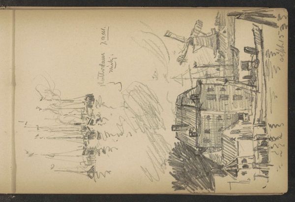 Alexander Shilling created this sketch with graphite, capturing a scene of houses nestled near a bridge. The drawing has a raw, immediate quality, evident in the energetic strokes that define the forms. Notice how Shilling uses line to suggest depth and texture. The density of lines creates shadowy areas while the sparser strokes indicate lighter, open spaces. The composition is carefully arranged to lead the eye through the scene. The architecture blends with the surrounding foliage, suggesting an integration of the built environment with the natural world. This interplay between line, texture, and composition destabilizes conventional distinctions between nature and architecture. Shilling encourages a dialogue between the organic and the constructed. The sketch evokes a sense of place while exploring broader themes of human presence within the landscape. It’s a study in visual communication, where simple lines convey complex ideas about space and perception.