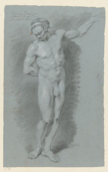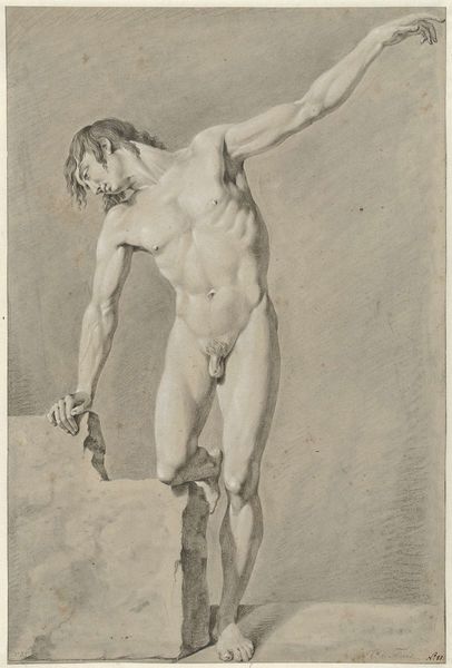 Pompeo Batoni captured this standing male model in a drawing, using confident strokes to define the subject. Notice how the man leans casually against a structure, a motif resonating through art history. This pose echoes the classical contrapposto, where the figure's weight shifts, creating a natural, relaxed stance. We see it echo in the sculptures of antiquity, like the Doryphoros of Polykleitos, where balance and harmony are expressed through the body. This borrowing from classical forms represents more than just an aesthetic choice. It is a conscious connection to a past era viewed as a golden age, seeking to imbue the present with the power and authority of antiquity. It signifies a cyclical return to foundational principles and the continuous reinvigoration of cultural memory.