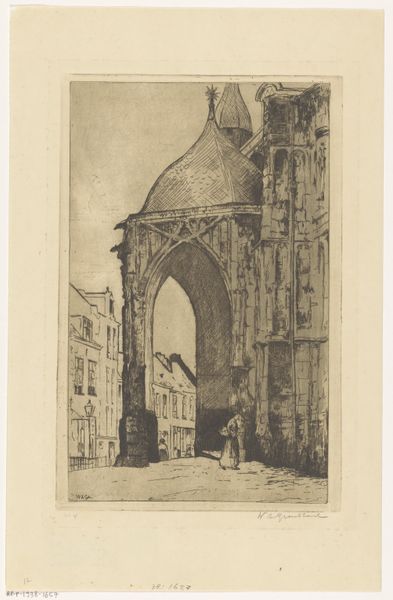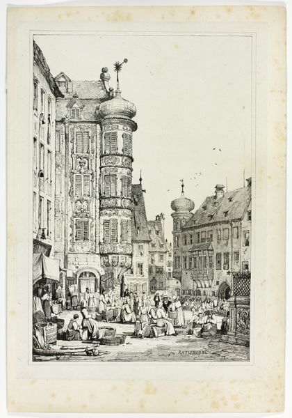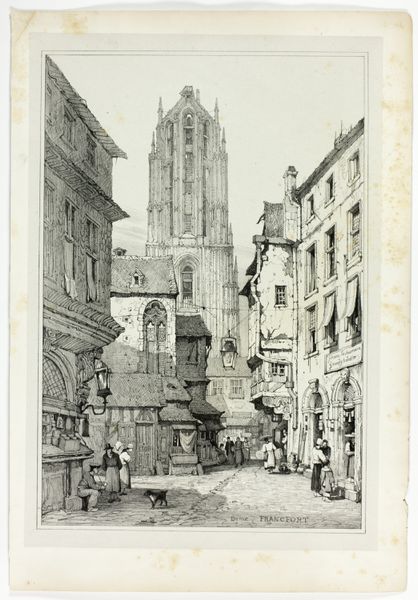 Editor: This lithograph, "S'Omer, Strasbourg" by Samuel Prout, completed in 1833, offers a striking cityscape. I’m immediately drawn to the contrast between the dark, looming structure in the foreground and the delicate cathedral rising in the background. What layers of meaning do you find in this work? Curator: Prout’s "S'Omer, Strasbourg" is brimming with cultural memory. Note the fortress-like structure, it evokes a sense of the city's history and resilience through conflict and protection. Then see how the cathedral, bathed in light, represents a spiritual aspiration. Prout seems to have strategically framed the divine and the man-made – doesn’t it give you a sense of the push and pull of power? Editor: Absolutely, I see that interplay. It makes me wonder about the people populating the marketplace; they seem so small and incidental compared to the architecture. Curator: Exactly! The Romantic era was all about the sublime, and Prout uses scale to emphasize humanity's place within a much larger, historically weighted landscape. Consider the choice to portray the figures in such casual stances. Editor: It is as if they’re dwarfed not just by the architecture but by the weight of time itself. Almost frozen in place. Curator: And what about those little flags atop the foreground structure? Consider that visual detail -- a proclamation? A symbol of possession, and a mark on this urban stage? Editor: That’s a fascinating point. The flags contribute to this multi-layered impression; an atmosphere charged with spiritual yearning and an undercurrent of temporal and militaristic force. I initially focused on the formal aspects, but I see how much symbolic weight is packed into this image. Curator: Yes. These images invite us to decipher how cultural identity takes root, in structure, in symbol and, most enduringly, in the collective unconscious.