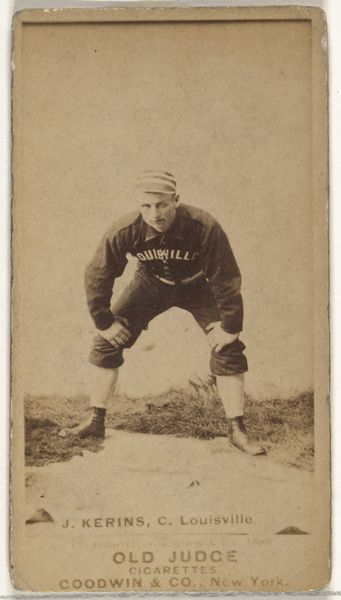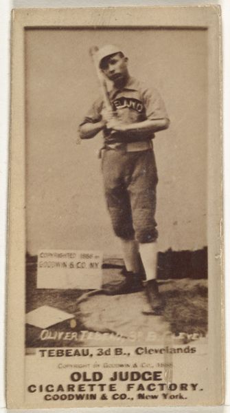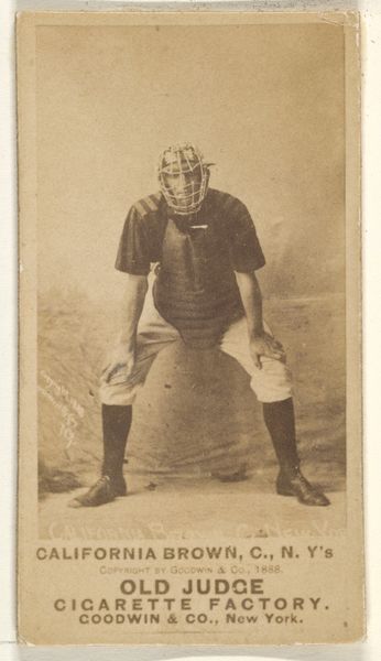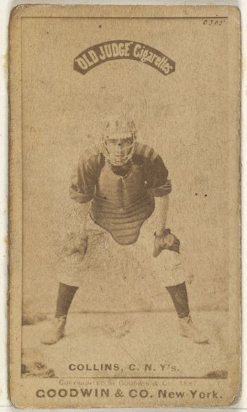 This photograph of Frank Sylvester "Silver" Flint, a catcher for Chicago, was produced by Goodwin & Company in 1887 as part of a series of baseball cards included with Old Judge Cigarettes. Printed on thin paper stock, it belongs to a tradition of commercial ephemera which exploded in the late 19th century, fueled by new printing technologies. The photograph itself would have been taken in a studio, meticulously staged. Then, many identical prints would have been made in industrial quantities. The sepia tone is achieved through chemical processes, typical for the era, lending a sense of nostalgia and historical distance to the image. The mass production and distribution of these cards reflects the rise of consumer culture, linking the consumption of tobacco with the burgeoning popularity of baseball. In this context, the image of Flint becomes a commodity, bought and sold as part of a larger network of capitalist exchange. The image thus reminds us that even seemingly simple things are tied to wider social issues of labor, politics, and consumption.