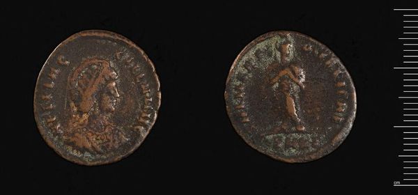 Curator: Let's turn our attention to this coin from Thessalonike, minted during the brief reign of Emperor Macrinus in the early 3rd century CE. Editor: It feels remarkably heavy for its size—almost ten grams. You can see how the copper alloy has aged, that patina really emphasizes the bas-relief. Curator: Macrinus' ascent to power was unconventional, to say the least; the images on coins like these were carefully chosen to legitimize his rule and connect him to tradition. Editor: Look at the way the die was cast; you can see the skill of the artisan. The deliberate use of specific metals would have also been tied to its value and power. Curator: Absolutely. The imagery of the coin itself—a depiction of the emperor on one side and a symbolic representation of the city on the other—reinforces the established imperial order. It's propaganda in miniature. Editor: It is a tangible representation of power. A small object that connected the people to the politics of the time. Curator: Indeed, it provides insight into the construction of imperial authority and its dissemination through the channels of everyday life. Editor: And for me, a connection to the artistry required in making such a ubiquitous yet significant object.