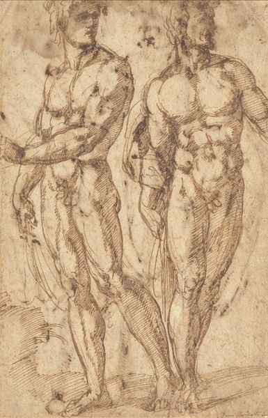 Curator: Here we have Bernardino Poccetti’s "Two views of a statuette of a young man," dating from the late 16th or early 17th century, an arresting study rendered in pencil. What strikes you first? Editor: Immediately, a sense of detached observation. The multiple viewpoints create a sense of objective study. The artist’s dispassionate depiction feels very detached. Curator: That detachment is central to its purpose. Notice how Poccetti captures not just the figure, but also varying angles and light. This wasn’t meant for public display; it was likely an academic exploration, echoing classical ideals but interpreted through the lens of Mannerism. Consider what the figure represents to Renaissance society—beauty, ideal form, and the height of masculine virtue. Editor: But doesn’t that very idealism serve to reinforce existing power structures? This “perfected” male form was exclusive, often tied to wealth and privilege. It presents a limited and quite toxic, I'd argue, model of aspiration. Think of the male gaze, but here directed inward, for self-contemplation and idealization, reinforcing societal expectations of performance. Curator: Precisely! The statuette itself serves as an ideal – a symbol. Its permanence contrasted sharply with human beings. By drawing two viewpoints, Poccetti attempts to grasp and contain this ideal. But, how does the artist make his individual mark? The Mannerist style distorts proportion, adding emotional intensity and subjectivity where it was not expected. It invites us to acknowledge artifice even in pursuit of the ideal. Editor: Though I agree with what you are saying about Mannerism subverting the ideal to some degree, there is still the imposition of control through rendering. Think about the history of anatomical studies during the Renaissance: Even what appeared as pure observation involved exerting a form of domination over the body being drawn. This, even with its stylistic flair, replicates that power dynamic. Curator: An astute observation. I’m captivated how Poccetti encourages a layered reading: simultaneously celebrating classical standards of beauty while complicating those concepts through both artistic practice and subtle deviation. Editor: It leaves you questioning who is this image truly serving and to what end, and I value this image for how it generates dialogue between intention and execution.