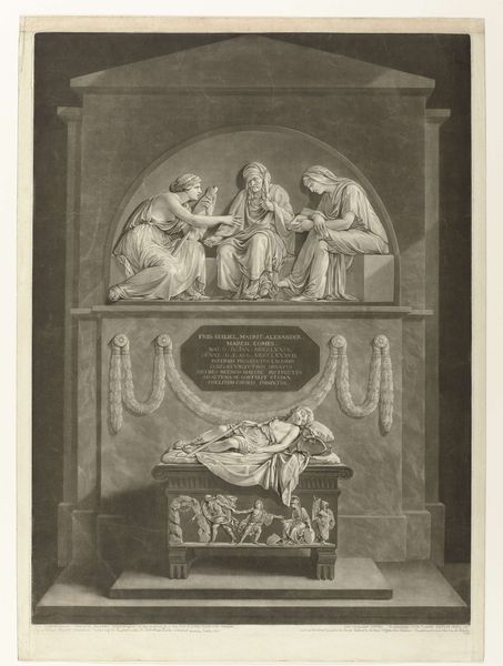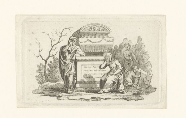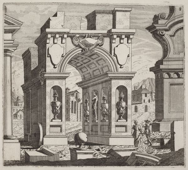 Curator: Let’s take a closer look at this print, dating back to around 1786. It's titled "Title Page," and it seems to be an etching and engraving, probably intended as the opening illustration for a book or collection of prints. Editor: Oh, I see it right away! It gives a dream-like sensation, as if Rome is both remembered and half-imagined. Ruins merge with precise renderings. Very sentimental and intellectual, all at once. Curator: Well, "sentiment" in relation to landscape prints wasn't an accident at this time. Think about the printmaking process in the 18th century. Etching allowed for relatively quick reproduction, spreading both aesthetic tastes and political ideas among a growing audience. Classicism becomes not just an artistic choice, but also speaks of empire, governance and even class. Editor: Right. But this particular composition feels layered with personal associations, too, not just cold political calculations! Look at how this lone figure sits amidst the crumbling architectural fragments. Almost like a scholar trying to reconstruct history from shards. Do you think they used some sort of camera obscura or similar tool? Curator: It's entirely possible. The precision in certain details would suggest so. However, the etcher's choice to incorporate different elements into a single tableau raises some questions. We can see what is probably an aqueduct or bath on one side and the artist has skillfully placed inscriptions celebrating patronage that ties into the Grand Tour. I would bet the quality of the ink, the paper choice – all these were factors for the book's eventual patrons. Editor: True! The book itself becomes a kind of portable monument, another layer in this web of history, patronage, and artistic ambition! Makes me think about our present and all the means by which art is shared today, instantly! The intimacy, texture and process all translate differently. Curator: Yes, and understanding that transformation – the labor, the materials, the economic structure – is vital for seeing not just this picture, but any picture, clearly. Editor: So it’s like unlocking the hidden stories, or, shall we say, etching away the assumptions. Wonderful.