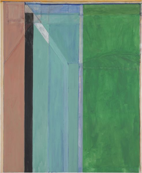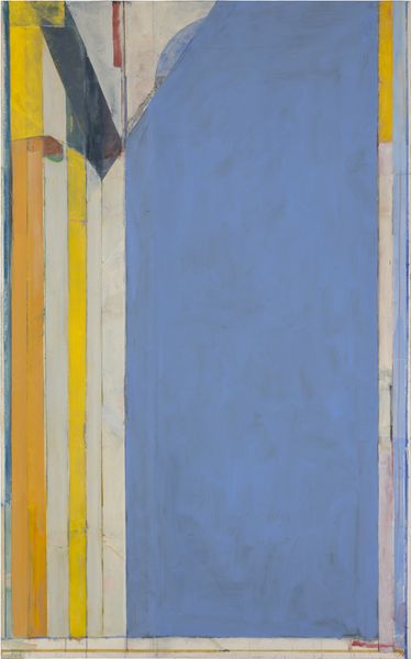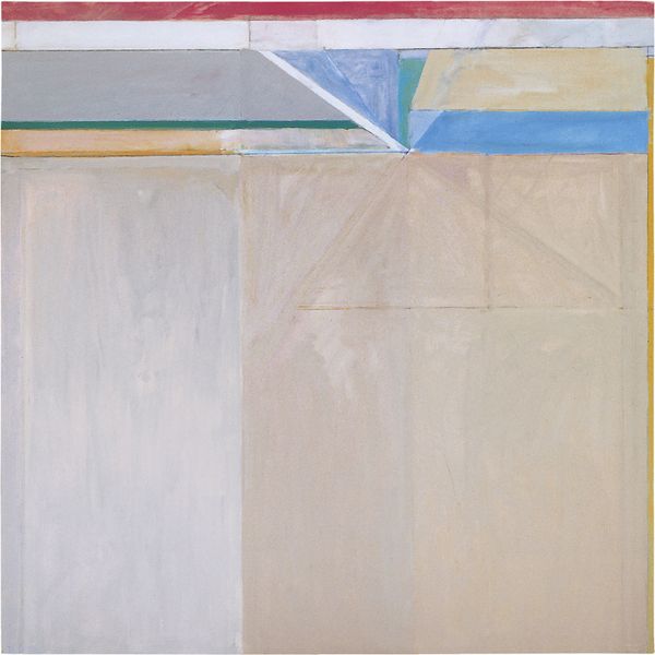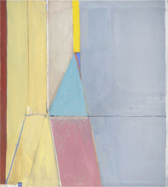 Curator: We’re looking at Richard Diebenkorn’s "Ocean Park #43", a compelling piece crafted in 1971 using acrylic paint. Diebenkorn situates this work squarely within the Color Field painting movement. Editor: My first impression is...serenity. A washed-out, almost faded memory of something bright. It reminds me of that feeling when sunlight bleaches everything near the ocean. A quiet peace, even. Curator: It’s fascinating how Diebenkorn’s exploration of color is deeply tied to place, isn't it? His "Ocean Park" series is heavily influenced by the airy, geometric landscapes he encountered while living in the Ocean Park neighborhood of Santa Monica. Editor: Absolutely. It's as if he's distilled the essence of that coastal light. The lines, though precise, don't feel rigid. More like suggestions, echoes of buildings and sky meeting the horizon. See the way those pale blues are sitting next to the raw umber shade! Like looking out a sun-drenched window, the artist is able to control visual complexity. Curator: And that's what makes his work resonate so deeply within discussions surrounding modernism—that ability to reduce form to its bare essence while still suggesting immense depth and atmosphere. One way to analyze this painting is in the context of Post-Painterly Abstraction, pushing beyond gestural expression towards planes of pure color. His ability to find order—to make grids interesting— speaks to his dedication and study. Editor: There's a humility too. I like how Diebenkorn leaves visible traces of his process – faint lines and underpaintings. They're whispers, saying, "this didn’t just appear. I worked at this," or maybe, “everything here is transient". I can almost feel his touch, a sort of back and forth...deciding and revising! I have felt his journey here, this feels really nice. Curator: Agreed. The visible pentimento and subtle layering of the colour reveal Diebenkorn’s willingness to show that tension. This is particularly fascinating when framed against prevailing conversations on abstract expressionism. The painting has historical and theoretical ties. Editor: The painting feels both intimate and infinite. What starts as a simple exploration transforms the piece. Thank you. Curator: Indeed. Through Diebenkorn’s geometric planes, the intersection of colour and experience continues to spark dialogue.