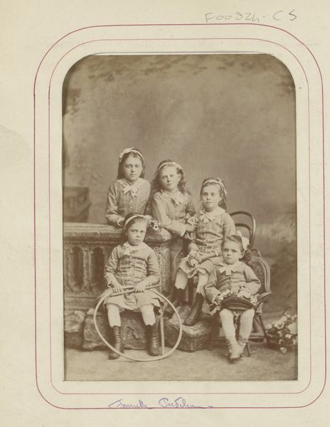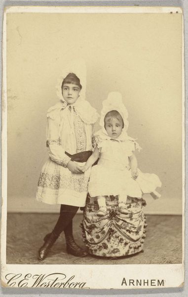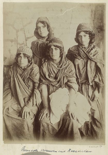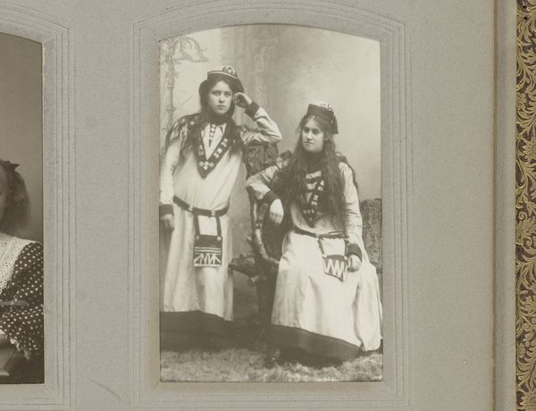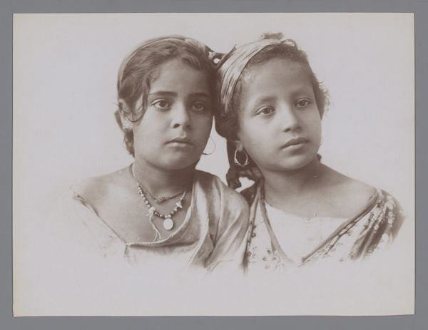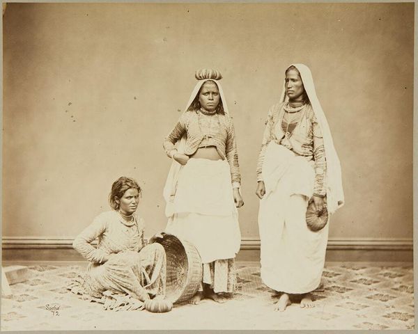 Editor: So, here we have what’s called "Groepsportret van drie Indiase vrouwen in Calcutta," a photograph from sometime between 1870 and 1900. It strikes me as a really staged and formal image, yet their direct gazes give it a powerful intimacy. What do you make of the symbolism and how it operates here? Curator: Well, let’s begin with the obvious visual cues. Notice how their clothing and jewelry are not just adornment; they speak to identity, status, and belonging. Think about how the arrangement—the central figure slightly elevated, flanked by the other two— subtly hints at social hierarchies, maybe even kinship. Can we read this in the symbols of their ornamentation? Editor: You mean how the ornamentation differs across the three women? That's interesting. Curator: Exactly! The act of photographing, particularly during this period, also carried its own cultural weight. The Western gaze often exoticized and Othered those outside its norms. The presence of classical European architectural elements -- column and vase -- might subtly suggest whose cultural values are being emphasized here. Are the subjects in control of their own representation? Or does it succumb to Western artistic conventions? Editor: That makes me think about the title, and how it categorizes them in a certain way – their own identities perhaps less important than their function, whatever that might be. Curator: Indeed. Look beyond the surface. These symbols speak to us from across time. What do they say about power, representation, and cultural exchange? Editor: I never considered the symbolic dialogue happening just within the jewelry itself. Now I'm thinking about the complexities of representation in colonial India, and the different layers of meaning embedded in a single photograph. Curator: And how that resonates even today. Symbols can transcend time, reminding us of the constant interplay of identity and perception.