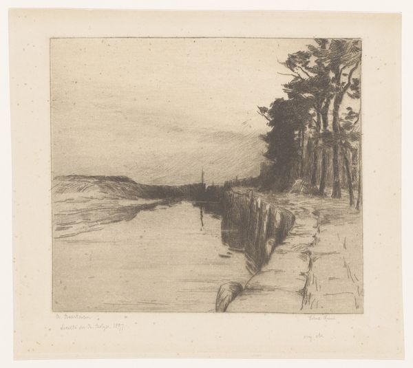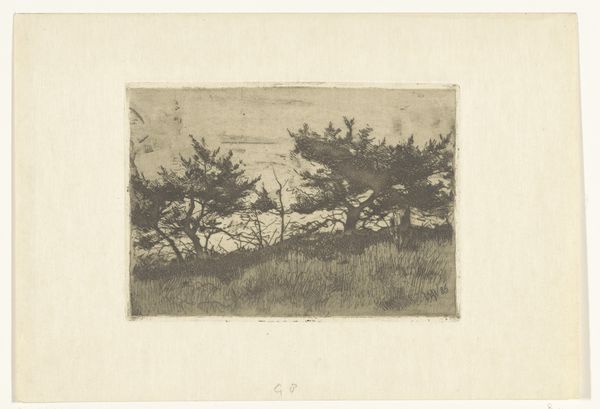 Willem Witsen created this etching, "Kustlijn van de Zuiderzee in Valkeveen," using a monochrome palette and subtle variations in tone. The composition divides the scene into three horizontal registers: the sky, the sea, and the land. This is an evocation of space and distance. Witsen uses the etching technique to play with light and shadow. The etched lines create texture, distinguishing between the reflective wet sand of the beach and the rougher, darker mass of the land. Notice how the artist varies the density and direction of the lines to suggest form and depth. The figures on the horizon, abstracted into simple silhouettes, are a study in scale, and reinforce the vastness of the landscape. The artist's manipulation of light and line also contributes to an emotional landscape. It could be said that the work's formal qualities evoke a sense of solitude and introspection, a visual metaphor for the transient nature of human experience against the backdrop of nature's permanence.