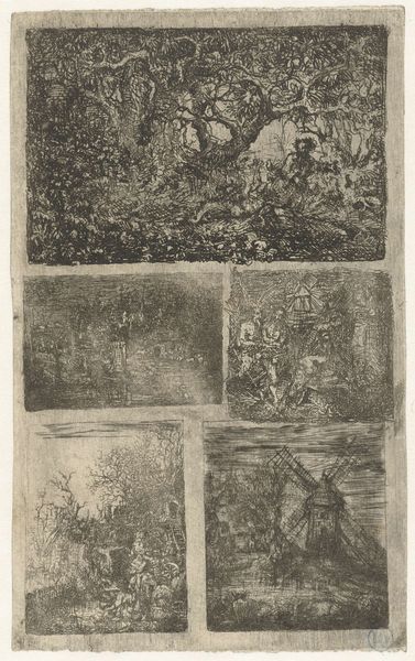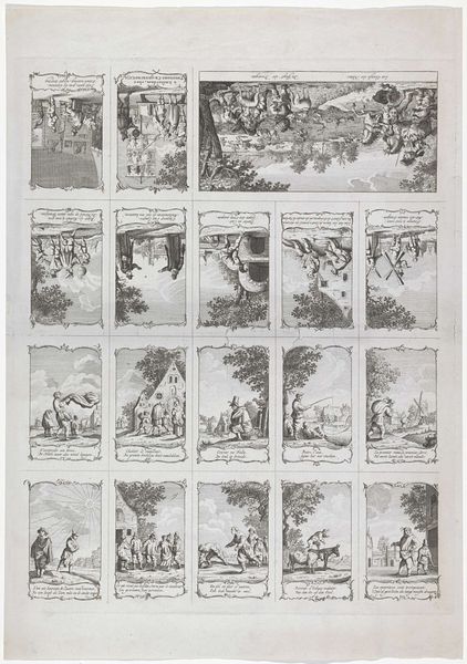 Curator: Here we have Daniel Nikolaus Chodowiecki's "Twaalf voorstellingen uit de geschiedenis van de eerste kruistocht," dating from around 1800. These twelve scenes from the First Crusade are rendered through etching and engraving, combining print and ink on paper. Editor: My first thought is the incredible detail Chodowiecki achieves with these relatively small scenes. The overall composition creates a narrative tapestry—it reminds us how much historical memory relies on circulated imagery, particularly about power and religion. Curator: Exactly. Think about the conditions under which this artwork was produced. As reproductions, engravings were inherently designed for distribution and collective viewing, which in itself democratized historical narratives, disseminating complex ideas to a broader public. How do you see this process influencing interpretations of power? Editor: Well, the material constraints immediately become visible. Each frame relies on precise lines etched with meticulous labor, demanding incredible control. Then there's the chemical process, the paper stock. The crusades were fuelled by access to resources, this art both echoes and participates in those power structures through consumption and image reproduction. Curator: Absolutely. Looking closer at some of the imagery— sieges, battles, and processions, it underscores the entanglement of religious fervor with violence and the political ambitions of various factions involved. It feels less like a straightforward account and more like a staging of ideological struggle. Consider who commissions such imagery, whose narratives it serves to reinforce. Editor: That is critical. I see each framed scene operating as a controlled exercise of narrative power, the selection, framing and printing – this controls the past through careful material action. It would be very revealing to study the origin and use of the paper on which the print was made. The availability of that stock might also subtly affect how this story can be circulated, changing interpretations across locations and income groups. Curator: True. Examining this piece, in its complete context encourages questions around historical agency, and representation that can offer nuanced perspectives on collective memory. Editor: Thinking about it this way deepens my understanding of this historical episode itself and also how interpretations take physical form and spread based on material possibilities.
