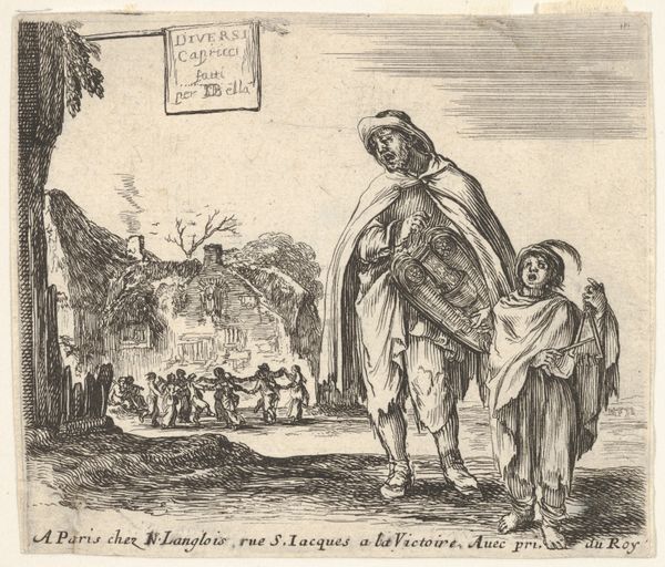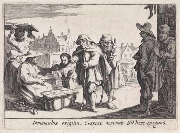 Curator: This print is titled "Three Arms on the Street," dating back to 1629. It's an engraving, likely meant for widespread distribution. Editor: It's immediately striking how it merges a close portrayal of people on the street with the barest outline of a cityscape in the background, but that stark composition amplifies the figures, and something in the expressions feels both weary and hopeful. Curator: Absolutely, it presents a visual paradox. Note how poverty is almost ritualized through certain iconographic signs: staffs for stability, children clinging, which speaks of a deeper narrative – the street itself representing a liminal space, a world turned upside down, perhaps referencing cultural anxieties about social upheaval. Editor: I am also focused on the lines themselves. The material reality of engraving dictates everything; each line painstakingly etched to conjure textures, volume, even shadow, to communicate an idea about social class, religious conviction or moral character. Curator: I wonder though: is this scene one of suffering, of social criticism, or are there are more encoded messages here, of resilience and adaptation? Notice the gestures, particularly the protective arms around the children—are they symbolic representations of kinship and care? Editor: Perhaps the print functioned like an early photograph, recording urban types and trades for posterity. Its affordability as a multiple also brings in the question of how many people had access to, and ownership of, this story about those on the street? Who did they make this "news" for? Curator: Fascinating – to consider its immediate context as both artistic object and as potential disseminator of popular belief. Its baroque flourishes of movement almost contrast to the gravity it depicts, thus adding complexity and dynamism to an essentially challenging subject. Editor: Yes, and the scale also plays its role. An easily circulated piece would carry new meaning dependent on its viewers and surroundings, as evidence that everyday materials can carry messages far beyond initial construction. Curator: The layered meanings embedded here speak not only to the artist’s time but potentially still resonant in our own. We witness history, vulnerability and yet still find visual echoes of strength, making the humble engraving a testament to both human suffering and perseverance. Editor: A perfect thought, it underscores that such material-based media are indeed never just static artifacts from a singular "golden" age, but continuously evolving parts of history itself.