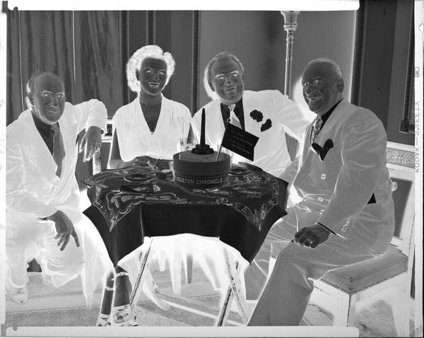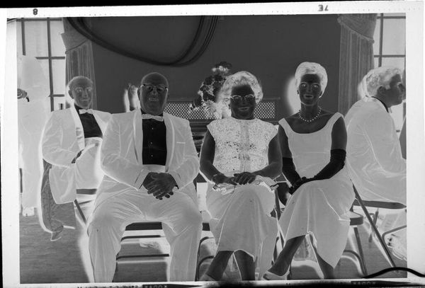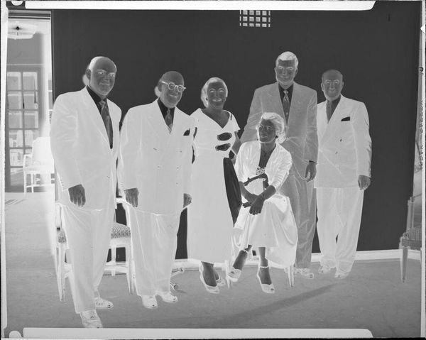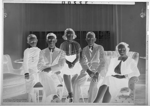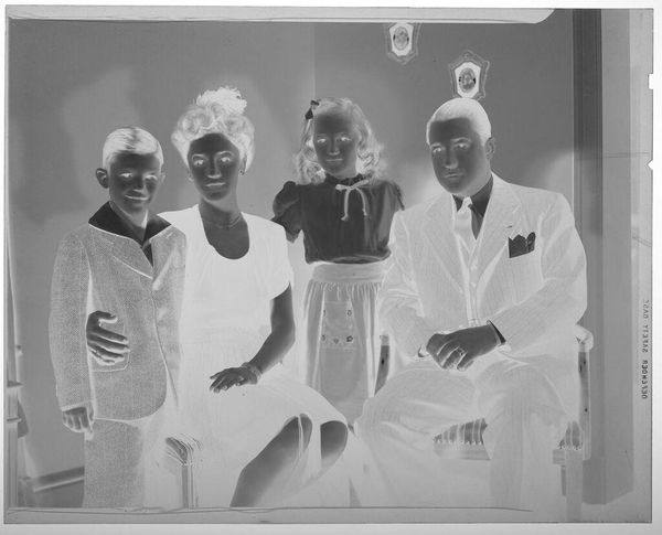 Editor: So, here's an intriguing photographic negative by Martin Schweig, simply titled "Untitled," depicting a family from an indeterminate date. The textures and patterns of the clothing are fascinating. What can you tell me about this image? Curator: This piece speaks volumes about the social context of photography. The family’s posed formality highlights the aspiration for upward mobility, reflected in their attire. The photographic process itself, from the negative to the print, signifies a carefully constructed image of family life intended for public display. Editor: That’s a great point. I hadn’t considered the public versus private aspect of the image. Curator: Think about the labor involved. From the manufacturing of the film to the photographer’s studio practice, these elements inform our understanding beyond the image itself. What do you make of that? Editor: It reframes it entirely, moving away from simply seeing a family portrait to understanding the materiality and the social forces at play in its creation. Thanks! Curator: Exactly. Seeing the image this way highlights a new understanding of the history embedded in this photo.