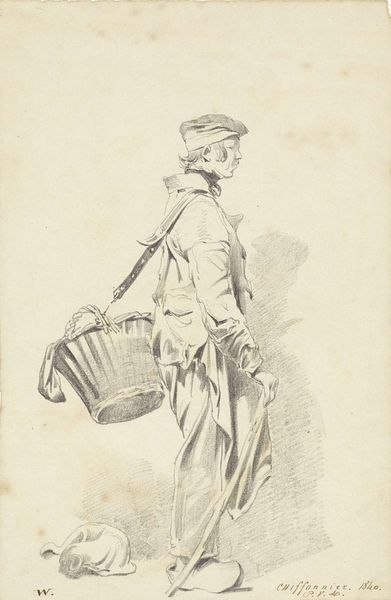 Curator: This drawing, titled "Woman with headdress and a basket, from behind", is attributed to Harmen ter Borch, possibly from 1652. It’s currently held in the Rijksmuseum. The piece is rendered in pen and ink on toned paper. Editor: Immediately, I notice how utilitarian it feels. The woman is carrying a large, woven basket and is shown from behind, which is quite unusual. There's a sense of anonymity, of her simply being a worker. Curator: Ter Borch was a master of observation. Note how he’s captured the texture of the basket and the way her clothing drapes, despite the economy of line. This drawing provides insight into the labor of women in 17th century Netherlands, a society fueled by trade. Her clothing, the bulky headdress – these details signal her position, perhaps a merchant's wife or a market vendor. Editor: The basket itself is interesting. Baskets are very old symbols—containers of sustenance and life. Think about the visual contrast here: we have the woman’s unseen face, replaced by a container of what might be the fruits, literally or metaphorically, of her labor. It speaks to me about provision and unrecognized effort. Curator: The materiality also deserves consideration. Pen and ink were readily available and relatively inexpensive at the time, so we're likely seeing a study, not a finished masterpiece. Ter Borch probably created it to prepare for a larger, more elaborate painting. Editor: It’s more poignant this way, though, don’t you think? The bare essentials. The simple lines emphasize the burden she bears, quite literally on her back, echoing the everyday labors that often go unseen and unappreciated in genre painting of the time. There’s a powerful human truth embedded here, in this lone figure and heavy basket. Curator: Ultimately, this seemingly simple sketch reminds us of the essential contributions made by ordinary people to the thriving Dutch economy and artistic culture. Editor: Absolutely, the artist transformed an everyday object into a study of symbols and their impact on human experience.