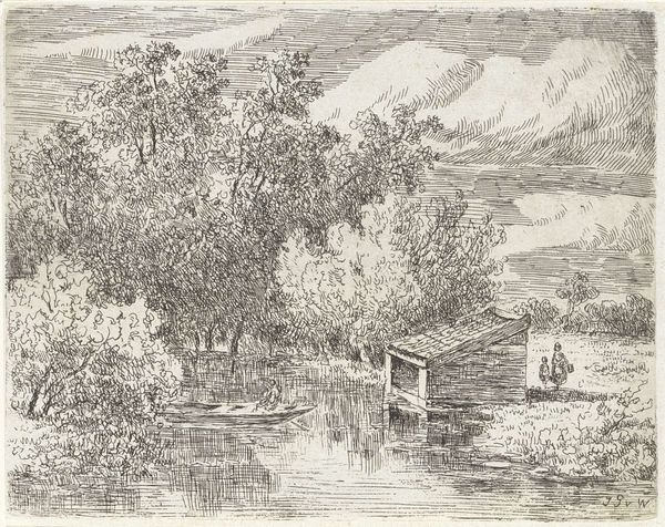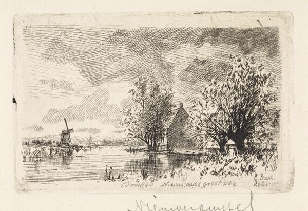Editor: So, this is "Landschap met een rivier," or "Landscape with a River," created sometime between 1859 and 1889 by Elias Stark. It's an etching. I find its muted tones and hazy rendering quite dreamlike and calming. What do you see in this piece? Curator: The dreaminess you perceive is intriguing. Etchings, due to their linear nature, often tap into the collective memory of seeing landscapes through a structured, almost analytical lens. Note the repetition of horizontal lines mirroring across the water. What feeling do those mirroring lines evoke? Editor: It definitely contributes to that sense of tranquility and stillness… maybe a sense of balance? I hadn't thought about it that way, but now it makes sense. It's not just a pretty picture. Curator: Indeed. Beyond aesthetics, landscape art like this often carries symbolic weight. Consider the placement of the house and the figure on the bank. Are they integrated or isolated? What statement could the artist be making about society's relationship to nature? Editor: I see what you mean. The house feels almost… adrift. And that lone figure, while small, is still present on the edge between land and water, like they’re contemplating the unknown. That makes the tranquility feel a bit melancholy, even. Curator: Precisely. The melancholic mood might suggest deeper contemplation about man’s role within, or perhaps separate from, the natural world, reflecting social changes happening during Stark’s time. Has your perception of the work shifted? Editor: Absolutely. It started as a calm, pleasant scene. Now I'm seeing layers of societal reflection woven into the imagery. It is much deeper than I had initially grasped! Curator: Visual symbols can open up new understandings about the world, our history, and our shared future, through continuous dialogue between artwork and viewer.