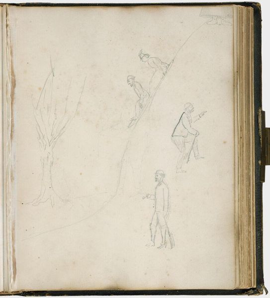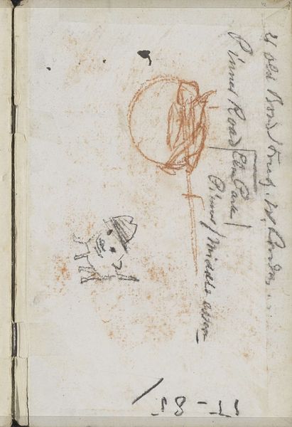 Curator: This is "Liggende hond" (Lying Dog), a pencil drawing by Jozef Israëls, dating from around 1855 to 1859. Editor: He looks so forlorn, doesn't he? A sad, scruffy pup rendered in the softest graphite. It reminds me of the dogs you'd see waiting patiently outside butchers' shops, hoping for a scrap. Curator: Absolutely. Israëls was deeply engaged with depicting the lives of ordinary people, especially the working class and the poor. He uses the genre painting as a social commentary. Consider the role animals played in those communities, particularly dogs. They weren't just pets; they were often working animals, companions in hardship, and symbols of loyalty and resilience in a brutal world. Editor: That rough sketchiness adds to it, almost like he was trying to capture a fleeting moment of stillness. You can almost feel the dampness of the street, and that weariness deep in the dog’s bones. I feel like he understands it implicitly, you know? I bet he gave that dog a bone later! Curator: Israëls lived during a time of increasing industrialization and urbanization in the Netherlands, and, we see him turn to scenes of rural life. His work reflects the growing awareness of social issues and the lives of those often overlooked or ignored by the wealthier classes. I think he is also interested in portraiture by using this kind of composition and style in order to give the subject personality. Editor: He has got such kind eyes... Or maybe it is a projection? Because the style is almost childlike, and open, as though rendered from an authentic emotional reaction to an encounter. A meeting on a rainy day... I think it is interesting he puts it in a notebook too with what looks like notes. He cares a lot about the details. Curator: Placing it within the pages of what appears to be a sketchbook really heightens the intimacy of the encounter. It grounds the scene in observation. And it reminds the viewer that the poor have inner lives as much as their supposed betters. Editor: Looking at this drawing has given me such food for thought. Sometimes I get jaded, but the tenderness and empathy in works like these snaps you right out of it, don’t you think? Curator: Yes. It's a quiet but potent reminder that even the smallest subjects can hold profound emotional and social weight, seen through an intersectional perspective of humanity and realism.