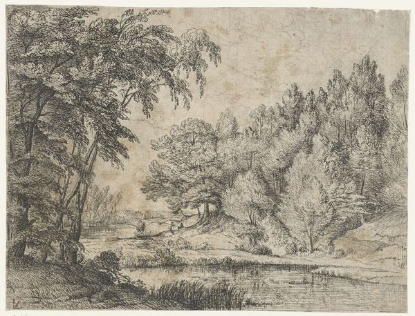 Allart van Everdingen created "The Broad River," an etching where landscape elements converge in a delicate interplay of light and shadow. Everdingen masterfully uses line and texture to construct a scene where nature is both inviting and imposing. The composition is structured around the river, drawing our eye through the dense foliage towards the distant mountain. Observe how he uses delicate lines to define the forms of the trees and the texture of the water, creating a sense of depth. The etching's formal structure invites a semiotic interpretation. The river, the mountain, the cabin; each element functions as a sign. Together they evoke themes of nature and humanity's place within it. Everdingen challenges fixed meanings of landscape art, inviting viewers to engage with a dynamic interplay between representation and perception. Consider how the formal qualities of "The Broad River" reflect a broader philosophical engagement with nature during the Dutch Golden Age, inviting ongoing interpretation and appreciation.