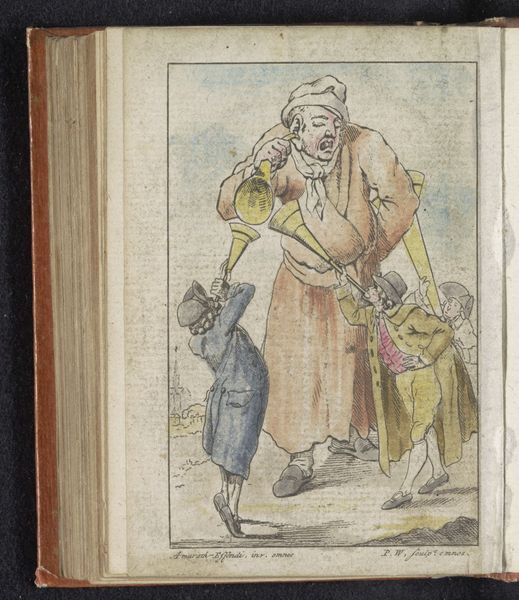 Curator: Ah, here we have Pieter van Woensel’s “Het Oude Licht,” created around 1795-1796. It’s a pen, watercolor and colored pencil drawing. What are your immediate thoughts? Editor: It strikes me as darkly whimsical. The use of aged paper creates this slightly unnerving feel. Curator: The drawing belongs to a larger personal sketchbook. Considering the era and its medium of sketchbook art, Van Woensel seems to be engaging with societal satire. What are your thoughts on that reading? Editor: I see your point. Note how the materials—pen, ink, and watercolor—lend themselves to quick, portable social commentary, probably not meant for formal display initially. Look at the layers: the aged paper speaks to a certain temporality, a material record of observations. Curator: The simian figures are the most striking element here. The central figure is dressed as a judge, complete with wig, but clearly bestial. How do you think the artist viewed the judiciary? Editor: Given the period and artistic tropes, I suspect there's commentary on those in power, their perceived intelligence or lack thereof. Consider too, the monkey dressed in human clothes, this creates the immediate thought of questioning human knowledge. Curator: Precisely. Now look at the donkey, also a figure of stubbornness or stupidity, being prompted by the reading monkey, is the rule of law really the most sensible decision when the donkey would prefer another thing? This is all a pointed social commentary of this specific point in history! Editor: The placement within a sketchbook offers clues, too. This piece, with its detailed lines achieved through varied materials, hints at artmaking as both labor and intellectual work. What's worth noticing here is what materials enable—cheap accessible production lends itself to biting commentary, without concerns of expensive material preservation. Curator: Ultimately, this little sketch, born from accessible materials, gives us so much to unpack about artmaking and social commentary during the late 18th century. Editor: I agree. From the paper to the ink, and the figures portrayed, the social milieu shines through its materials, creating not just an image but an artifact of its time.