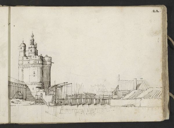 Curator: Before us, we have "Lokhorst oftewel Oud-Teilingen" by Roelant Roghman, a drawing likely created between 1646 and 1650, rendered with pencil and pen. It depicts an architectural view and it is part of the Rijksmuseum collection. Editor: It possesses such a wistful quality, doesn't it? The lightness of the pencil creates a sense of faded memory, as if glimpsed through time itself. Curator: It is more than just capturing a likeness. Roghman came from a family of artists and printmakers and throughout his career he depicted castles and landscapes in the Netherlands and he clearly had a precise goal in representing and recording it. Editor: It's interesting you frame it that way. To me, the crumbling edifice invites a dialogue about power structures. Were these landscapes readily accessible or were they only open to elites? How did this artwork challenge, reinforce or exist outside such social confines? Curator: We know that country estates in that period had significant economic power, with influence over resources and land, as demonstrated in their role in land ownership and labor relations. I think it’s about the power dynamics of place during the Dutch Golden Age. The imagery of these decaying structures speaks volumes, though, hinting at decline and shifting social dynamics. Editor: Precisely! This work becomes part of a wider narrative of change and instability, challenging any nostalgic or purely aesthetic reading. The architectural precision provides an objective ground, while Roghman's aesthetic choices evoke pathos. I consider that dichotomy an intentional juxtaposition to make statements about class, privilege, and historical impermanence. Curator: These drawings give a glimpse into 17th-century Holland, as places of power and leisure but more crucially through the development of new notions of public space. Editor: This perspective shapes my understanding and makes me re-evaluate its place in historical discourse. It also challenges me to recognize these visual cues in our contemporary visual culture.