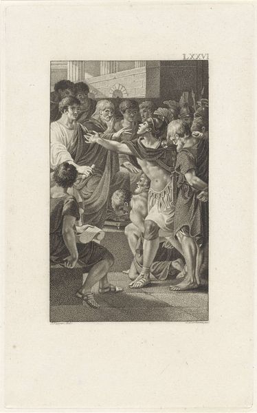 Curator: This engraving from 1793 by Ludwig Gottlieb Portman, titled "Virginius doodt zijn dochter Virginia," depicts a dramatic scene from Roman history, rendered in meticulous detail. The print itself is held here in the Rijksmuseum. Editor: It’s immediately striking – the stark contrasts achieved through the engraving process heighten the tension. There's a theatrical quality to the composition that grabs you. Curator: Absolutely. Portman worked within the Neoclassical movement, which valued clean lines and rational subjects. Note how the medium, the print, is here being used to disseminate stories of civic virtue and sacrifice during the rise of revolutionary political cultures. Editor: Indeed, the academic precision is evident in the anatomical accuracy of the figures, as well as in the considered positioning of each element within the frame. Consider the lines of the buildings behind the drama versus the implied chaotic emotional state of the individuals that comprise the artwork. Curator: Portman, working in this format, engaged in a longer tradition of using reproductive prints to democratize access to important cultural narratives. How effective were these types of visual devices, engravings, at molding public sentiment and distributing interpretations of history? It begs to be asked when we engage in our own current practices. Editor: Looking at the formal elements, it’s interesting how the central figure of Virginius, with his raised arm and gleaming blade, forms a vertical axis, dividing the composition and adding a strong sense of impending action. The use of line emphasizes a moment of brutal resolution. Curator: And in terms of the history painting context of its era, it echoes the broader debates about morality and power that gripped European society. To view it through such a lens invites reflection on our modern socio-political engagements and struggles as they relate to power structures. Editor: Reflecting on this work now, I appreciate how it manages to combine a narrative of intense emotion with such classical order. It is a real testament to Portman's formal mastery and insight, creating this incredibly potent experience for any viewer, no matter what period in time they may be viewing it in. Curator: Seeing how a simple print carries these multiple layers – historical, social, technical – really highlights the richness in even seemingly straightforward artworks. It certainly emphasizes for me the interconnectedness of art, production, and society.