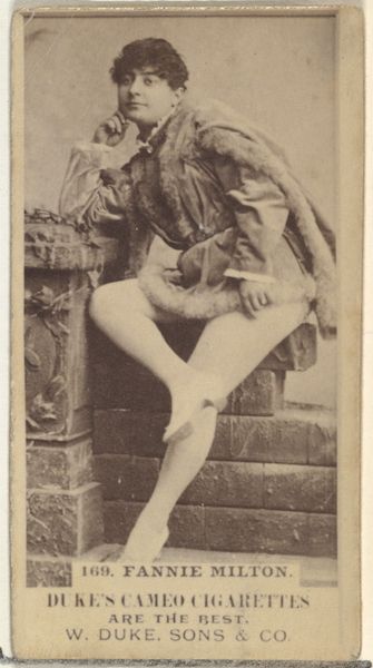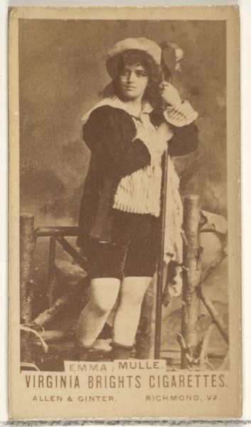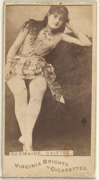 Curator: This is "Molly Mack, from the Actors and Actresses series (N45, Type 1) for Virginia Brights Cigarettes" dating from 1885 to 1891. Editor: Well, the sepia tone immediately places it, and there's a distinct sense of performativity; a woman in costume and pose. It's staged but intriguing. Curator: Indeed. What strikes me is how this was essentially a marketing tool. These cards, small in size, were included in packs of cigarettes. Imagine the scale of production! The sourcing of paper, the printing processes, the distribution networks…it’s a fascinating glimpse into the culture of consumerism at the time. Editor: The exotic elements are really compelling. The kimono-like garment, the painted screen behind her… They speak volumes about the West's fascination with, and perhaps misunderstanding of, the East during that era. The fan becomes a powerful symbol, hinting at hidden stories and cultural appropriation. Curator: Absolutely, we need to remember that this is, in essence, an advertisement. The exoticized imagery of the actress Molly Mack serves to sell a product—cigarettes—by associating it with luxury and intrigue. Notice the typography; the fonts and their placement become tools in selling this Orientalist fantasy. Editor: So, it's about constructing an identity, not just for the actress but also for the consumer? A cigarette is not just tobacco; it's an invitation to step into a world of exoticism and fantasy through associations built in the consumers mind. Curator: Precisely! And the collectability factor of these cards only reinforced consumption. The series format encourages repeat purchases, each new card bringing the consumer closer to owning the entire set, each cigarette bringing them closer to cancer, though that connection had not yet become widespread knowledge. Editor: That layer of advertising definitely complicates how we look at this photograph now. There are uncomfortable associations now, but it highlights how something as seemingly innocent as an image carries encoded meaning about power, commerce, and desire. Curator: I see it as a snapshot of the cultural machinery at play, both beautiful and disturbing. Editor: And the layered meanings beneath a picture of an actress are profound.