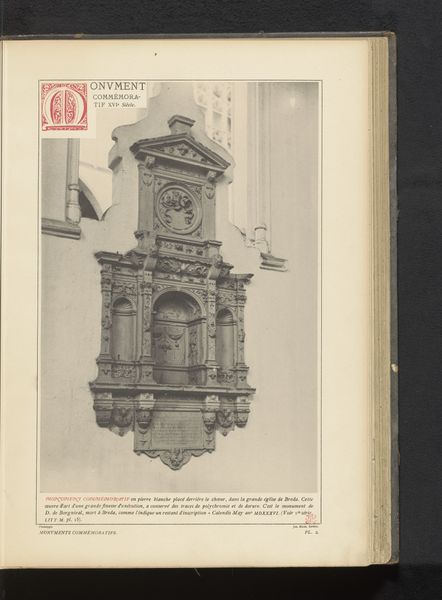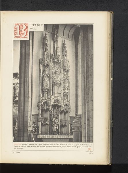 Editor: Here we have an image of "Stenen tabernakel in de Sint-Martinuskerk te Aalst," dating to before 1889. It appears to be a print of a stone or possibly wooden tabernacle. I'm immediately struck by its geometric qualities and the intricate ornamentation. What do you see in this piece from a formalist perspective? Curator: The composition displays a remarkable balance between verticality and horizontality, doesn’t it? The print masterfully captures the play of light and shadow, emphasizing the various planes of the tabernacle's architectural structure. Note how the artist guides the eye upward through the progressively intricate layers. The very texture seems to vibrate. What semiotic clues can we identify that amplify the intended viewing experience? Editor: I suppose the height draws our eyes up towards a divine or higher place? And I didn’t notice the balance you’re talking about. Curator: Indeed. Consider the geometric patterns incorporated into the tabernacle’s design. Can you see how squares, rectangles, and perhaps even implied circles contribute to a sense of order and harmony? This order is subtly complicated by the organic forms introduced via figuration. Notice the tension between the geometric versus figurative representations. Editor: Ah, now I see! So, it is like a geometric framework with figurative embellishments… that really shows me how the artwork comes together to enhance its overall impact. I didn’t see that at first glance. Curator: Precisely. By examining these formal elements, we start to decode not just what the work depicts, but also how it operates as a visual experience and perhaps even something tactile, depending on the original object and its various layers of creation. It is so much more than just the scene itself. Editor: It's amazing how much can be understood simply by observing the artwork’s inherent formal qualities. I have a totally new appreciation for what a formalist approach offers.