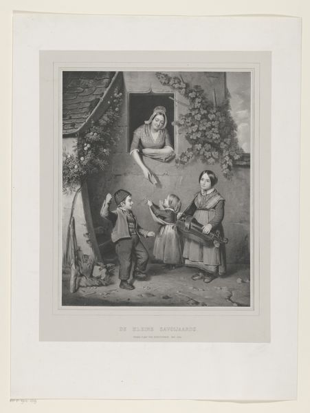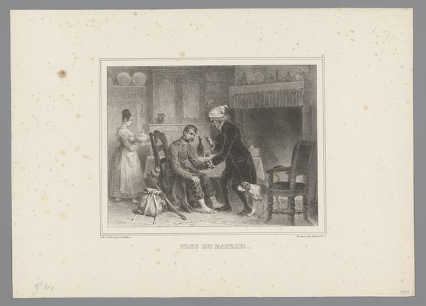 Editor: Auguste Raffet's etching from 1834, charmingly titled "Boer poseert lachend voor een man die een portret maakt," or "Farmer posing and smiling for a man making a portrait" strikes me as a little theatrical. There's almost a sense of performance about it. What do you see when you look at this print? Curator: You know, it’s funny you say "theatrical," because that’s exactly where my mind wanders! Think about this frozen moment; Raffet’s inviting us into a world where art is encountering real life, isn't he? Here's this farmer, seemingly the center of his community, having his likeness captured, perhaps for posterity or just a bit of local amusement. Editor: Absolutely! The onlookers definitely add to that sense of staged drama. What do you think Raffet was trying to say through this captured moment? Curator: Maybe he’s musing on the democratizing power of art? Consider that prints, at this time, made art more accessible. Could Raffet be suggesting that art isn't just for the elite, but for the "everyman," immortalized, quirks and all? Perhaps there is an element of Romanticism and idealized peasants; although classified as Realism, I feel he may be flirting with both concepts in order to capture the scene. And, is it just me, or does that dog look particularly pleased with itself? Editor: Ha! You’re right. Maybe the dog's the real artist here, judging by that proud posture. But seriously, this has made me think about how portraiture itself can be a performance, for both the artist and the sitter. Curator: Exactly! And Raffet beautifully captures that fragile dance between subject, artist, and audience. Next time you’re sitting for a photograph, remember Raffet’s farmer—you're part of a long and lovely tradition of human expression!