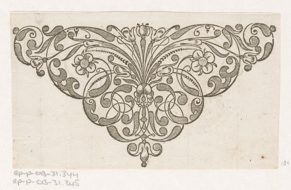 Editor: Here we have Hans Janssen's "Spits met ranken met bloemen," created in 1631, using ink on paper. It has an ornamental quality that's really striking. What can you tell me about how this kind of drawing fit into the artistic landscape of the time? Curator: Well, consider the rising merchant class of the 17th century. Their homes became spaces to project status and wealth. Ornament like this wasn't just decorative; it was a symbol of upward mobility and engagement with a sophisticated visual culture. Do you notice how precise and controlled the lines are? Editor: I do. The detail is amazing. It seems like it could be a study for something larger, maybe some kind of metalwork or architectural detail? Curator: Precisely. These drawings circulated as models for artisans. Think of them as early blueprints, playing a vital role in standardizing design and taste. The art market in this period wasn't just about paintings. Prints and drawings democratized art and disseminated new styles throughout society. Do you see any recurring patterns? Editor: Yes, there’s definitely a repeated floral motif and this symmetrical design is super striking. Is this typical of the time period? Curator: Absolutely, symmetry and balance were highly valued in the Baroque era. The elaborate scrollwork reflects a desire to showcase craftsmanship. This piece isn’t just aesthetically pleasing; it's evidence of art's integration into commerce and daily life. Editor: So it's an intersection of art, social status, and the emerging marketplace. Fascinating! Curator: Exactly. Analyzing this drawing opens a window onto a whole network of workshops, patrons, and the public consumption of art. Editor: That's given me a whole new perspective on appreciating these designs.
